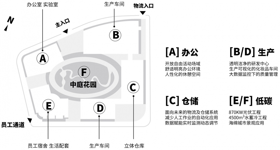 中研集团主要从事高端美妆产品的研发和生产,是广东省药监局首批认定的创新服务重点企业,积淀的科研实力奠定了中研尖端的行业地位。中研星园将作为总部核心工厂,与护肤品工厂、彩妆/香氛工厂、香水和气雾剂工厂一同构成中研的制造矩阵。为此,业主将星园定位为兼具效率和人性化的未来办公厂房形态。