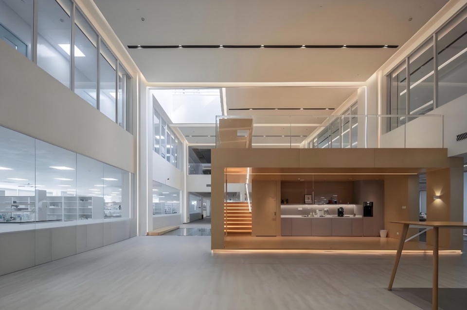 随着产业细分与技术升级,包含商务办公、实验研发、生产加工、智能仓储在内的多种功能已可在一个复合形体内实现。本项目试图将办公、科研、品控、检测等产业链上的不同环节并置于一座工业建筑的垂直叠层中。根据不同职能需求,完成从模块到片区,从独立到共享的空间重组。穿插其间有不同尺度与私密性的会议空间,构成精细化的交际场所。