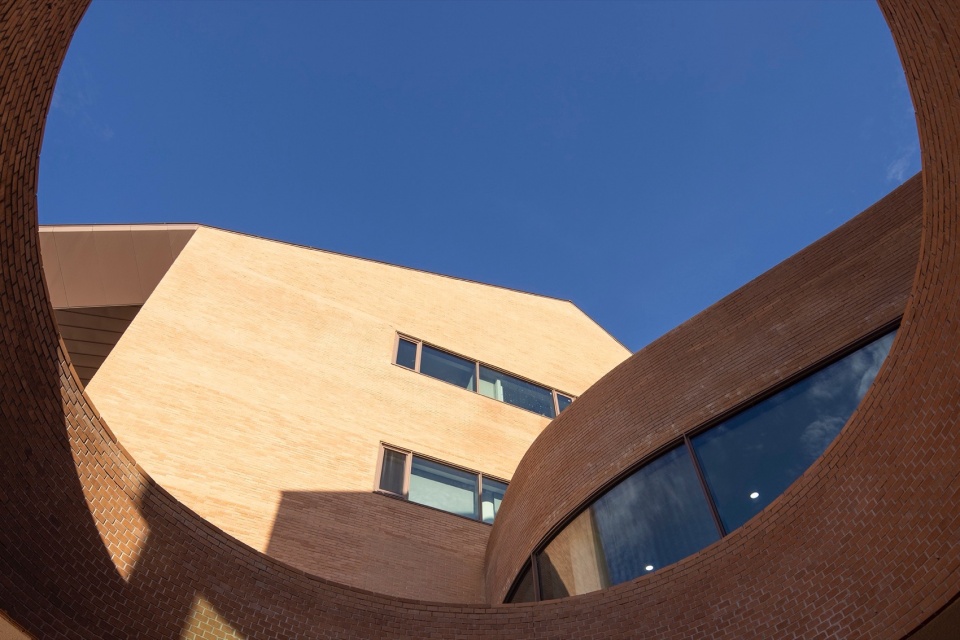 我们用连续的钛锌板坡顶屋面与大面积的清水砖墙组合,直立锁边系统的钛锌板拥有很好的自修复特点,常年使用也光洁如初;清水砖墙特意选择了浅咖啡色页岩砖来砌筑,保留了传统红砖的沉稳又增加了一些活泼现代,砖的特性会让墙面随着岁月的变化而变化,我们尝试用这样两种反差的材料,表达手工与机械、温暖与寒冷、现代与传统、历史与未来的对话。