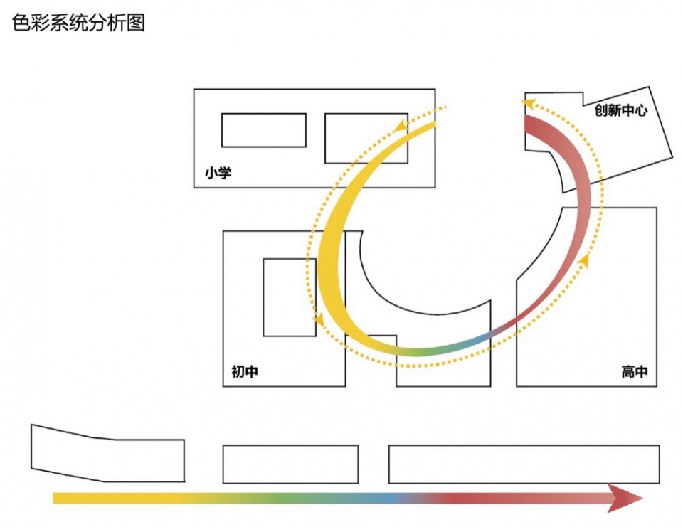 校园内主要教学空间围绕椭圆形的中央庭院展开,东侧是相对独立的steam中心、时光博物馆、行政办公和国际高中部,西侧是义务教育的小学部和初中部,之间设置剧场、体育馆、游泳馆等共享功能,连续立体的四季廊串联各个功能的公共空间,是校园内最活跃的主街,同时在夏热冬冷的天津地区为师生提供了舒适的室内连通。义务教育与国际高中均有各自独立的庭院与体育活动空间。校园南侧是相对安静的初、高中宿舍与教师公寓,地下除去必要的停车与家长接送落客系统外还结合下沉庭院布置了师生餐饮用房。