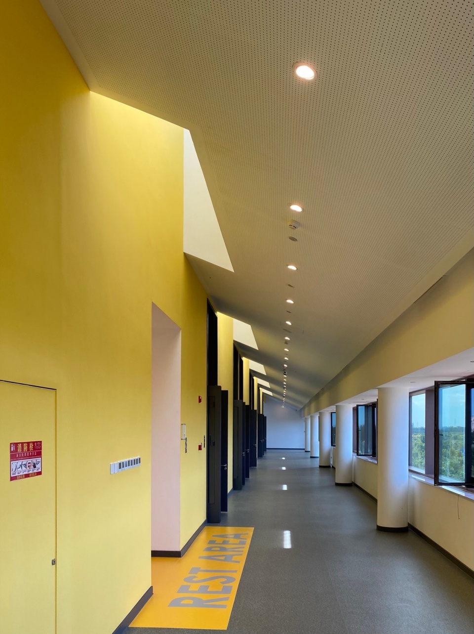 另外,连贯而丰富的室内空间需要与其对应的空间识别性与学部归属感,校园通过色彩系统分级、分区来对应不同年龄段、不同公共属性的室内空间。义务教育以明黄色为主,国际教育以玫红色为主,steam中心为青色,成人、附属空间为灰色,公共空间等则以木色为主。