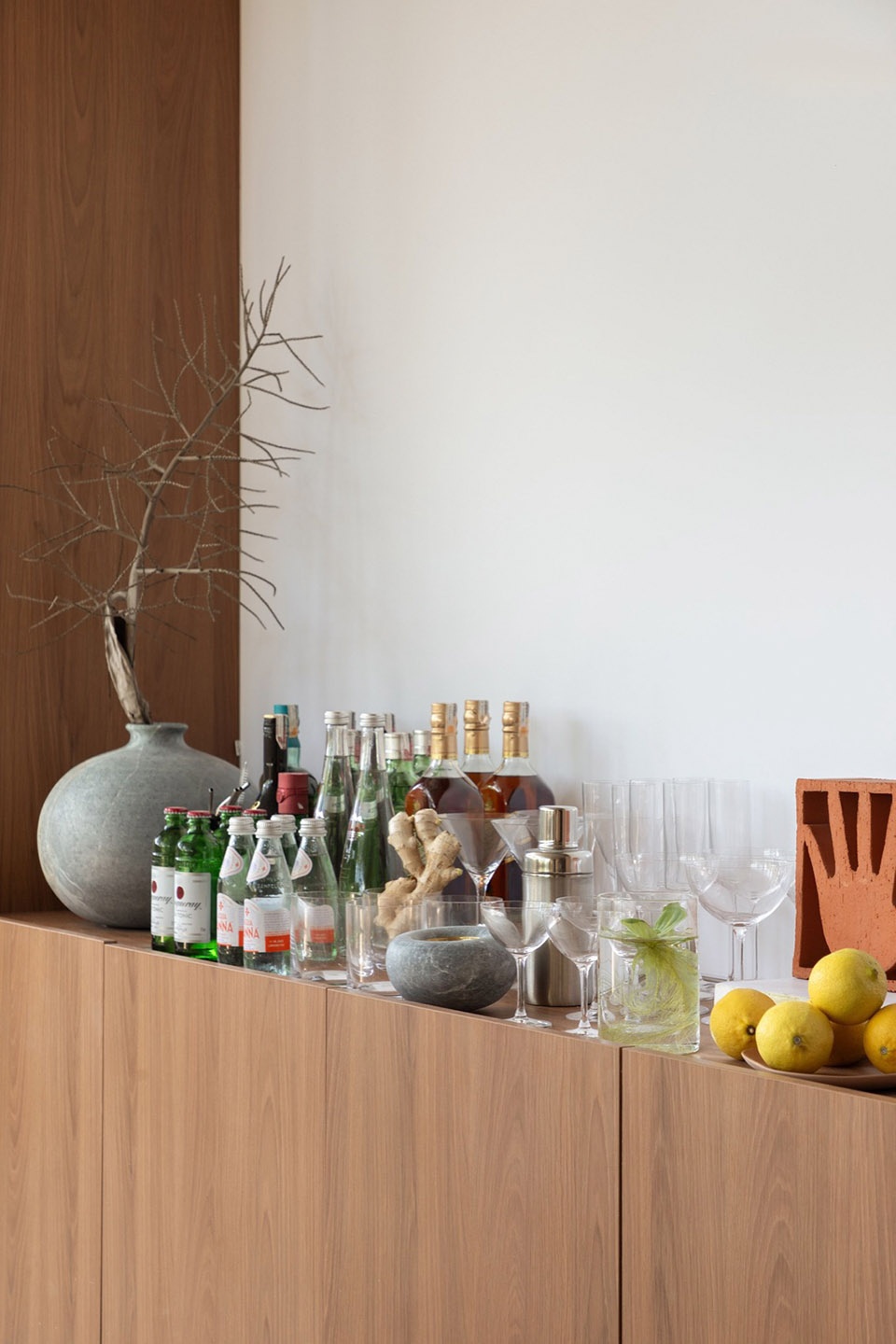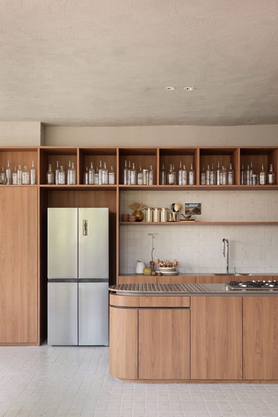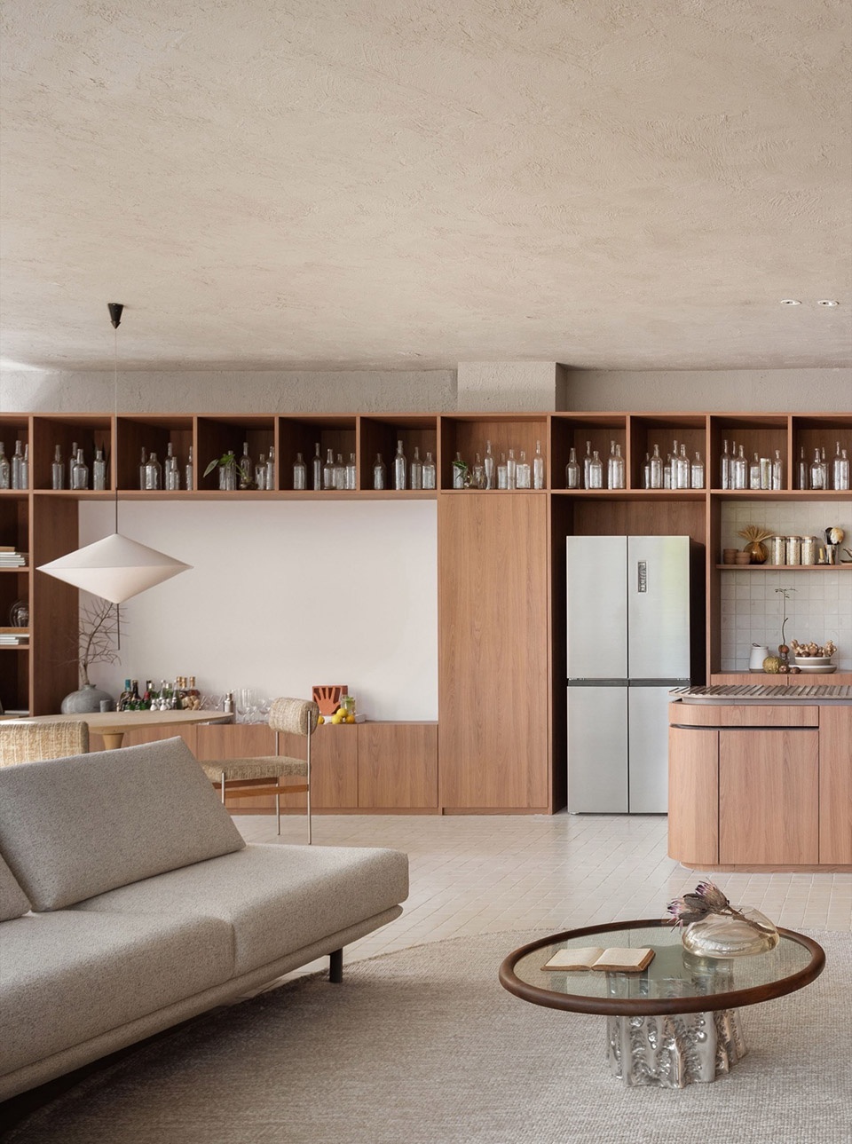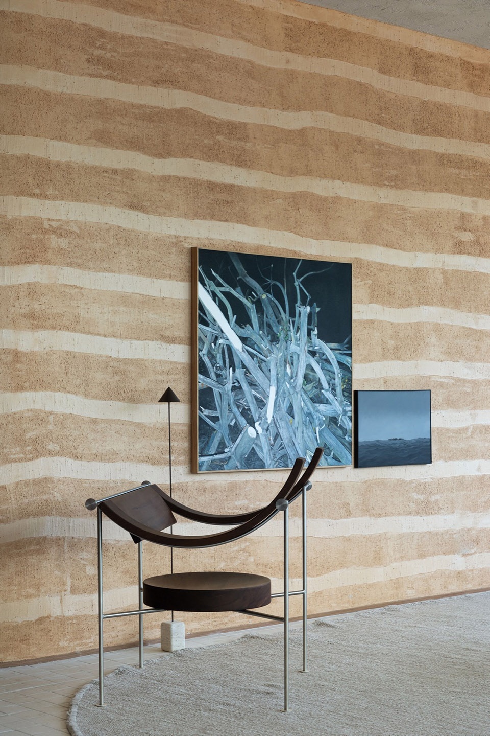 Present, the Now, brings us the central perspective that Change is movement. The catastrophe of Porto Alegre is another example that the time has passed to communicate the urgency of how we see the Environment. The project seeks to evoke natural elements such as the natural earth coating that covers the only curved wall that divides the main spaces. Historically, taipa walls were synonymous with low status. In our project, it is a strong appeal and appears as a reinterpretation of what luxury is, after all, the valorization of manual work and the way we manipulate raw materials is the guiding perspective for the whole space.