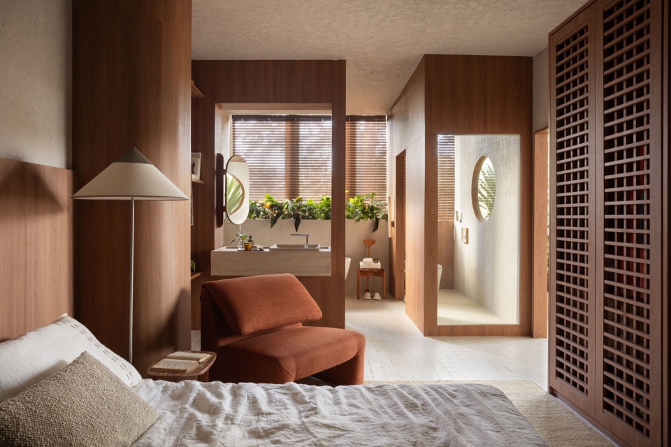 在这个多功能架子中,我们讲述了工作、烹饪和放松时光的故事。所有部分都被细小的凹槽包围,其中存放着居民的回忆和特别的时刻,讲述着他们的生活故事。生活区(Jantar):一张大型沙发将整个空间融为一体,精心挑选的本地艺术家和设计师的作品展示了不依赖于工厂生产过程的独特作品,手工制作的艺术品,并尊重良好的木工制作工艺。梦想区(Sonhar):一个邀请放松的房间,没有过多的奢华,反映了停下时间进行自我关怀的重要性,连接人们与他们内心的自我。一张大型的软垫床和一把舒适的阅读扶手椅,均置于一块丰富的天然纤维地毯上,营造出温馨感,柔和的间接照明来自落地灯,配合直射光照亮艺术作品,增强了空间的舒适氛围。沐浴区(Banhar):一个小型水疗区与卧室相连,激发嗅觉感官,并以景观设计和福祉为边界。浴缸是放松的邀请,作为空间的核心元素,配有由知名设计师签名的Deca配件和金属材质。为了空间的功能区分,我们特别设计了一个私密的淋浴环境。