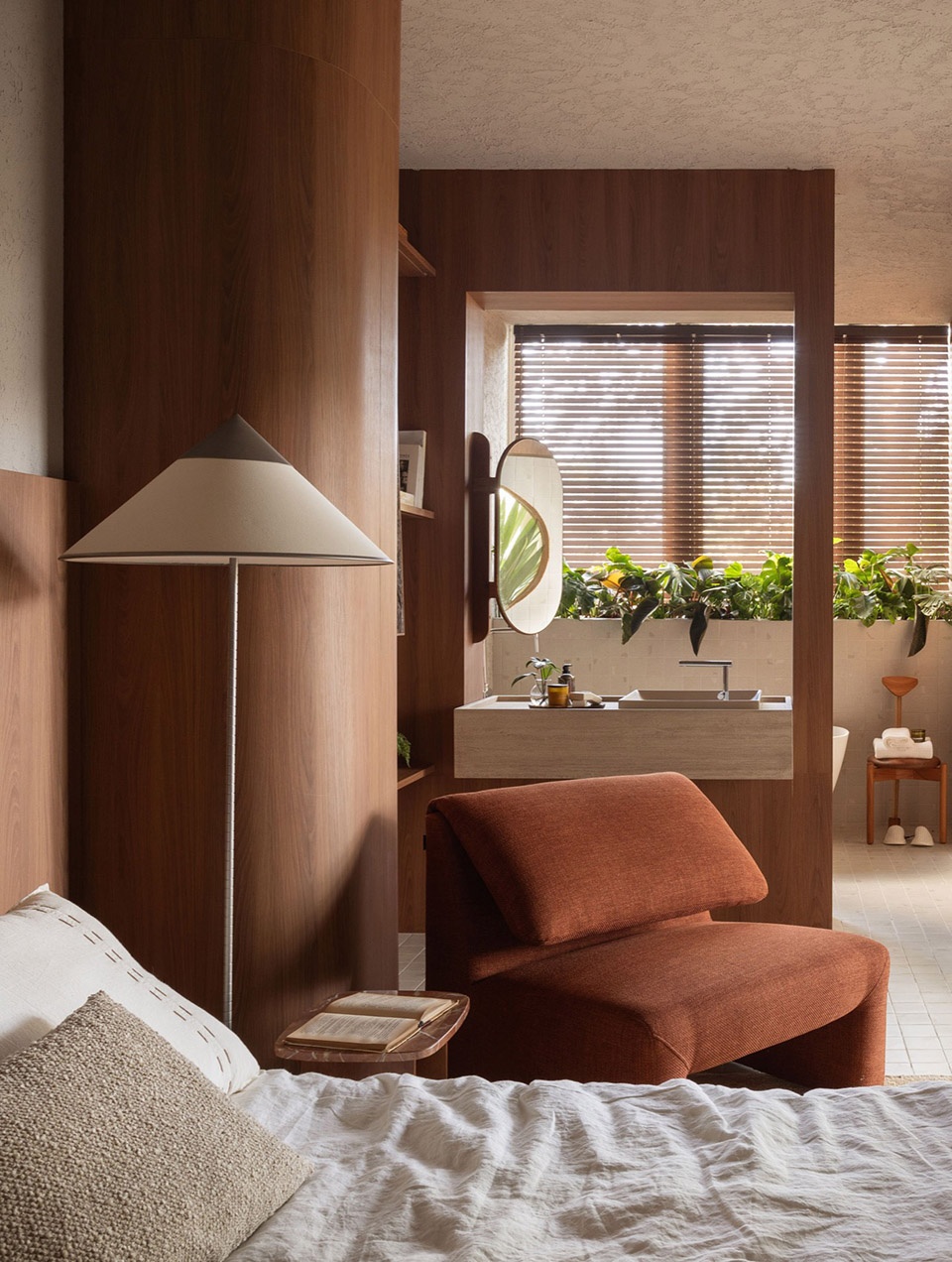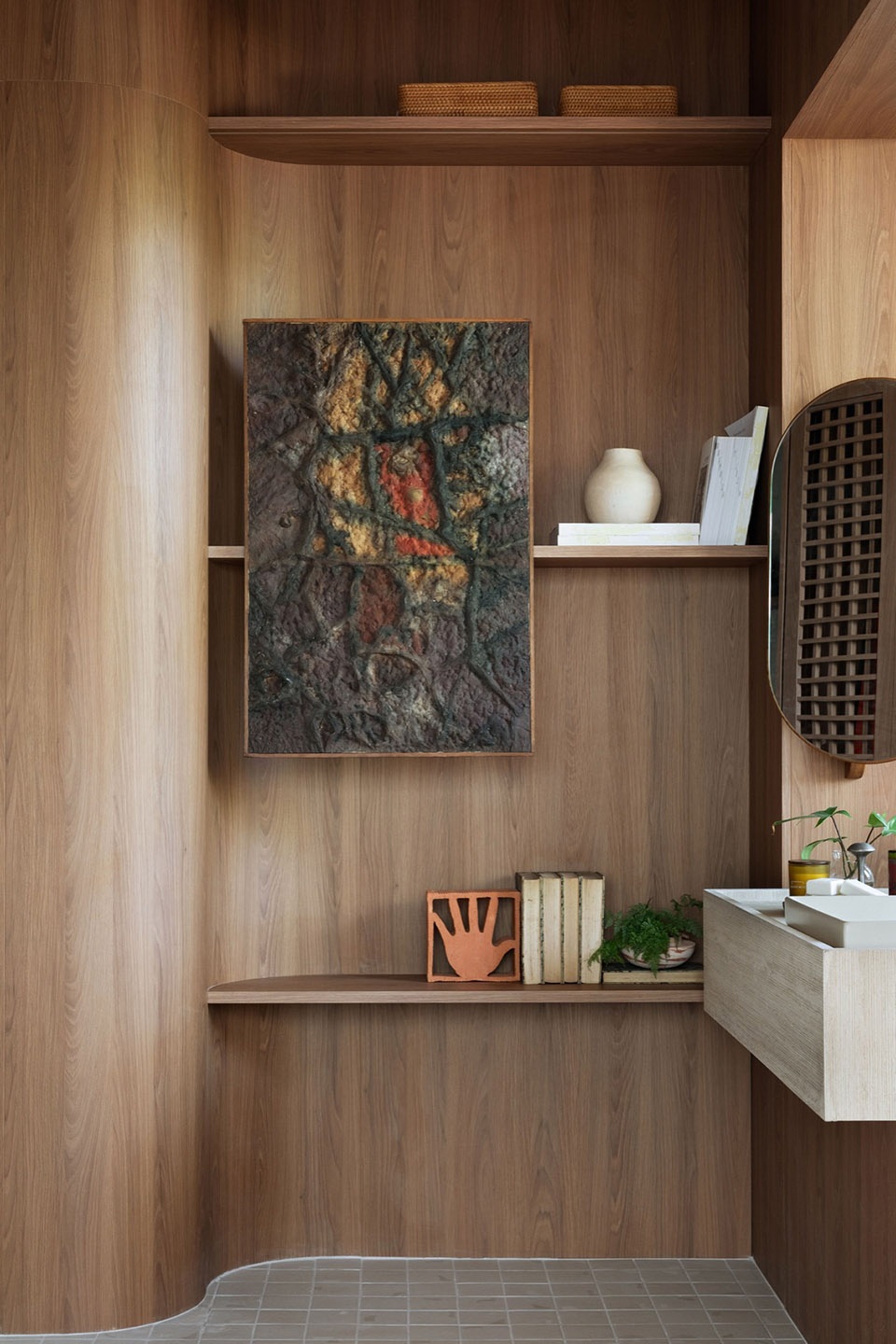In this multifunctional shelf, we narrate work activities, the daily life of cooking and the importance of moments of relaxation. All are surrounded by niches where we find the memories and special moments of connection that tell the stories of those who inhabit it. In front of this monumental woodwork, an island with rounded corners allows you to expand the work area and creates a connection with the dining space, meetings, and quick meals. Living (Jantar): A large sofa embraces the integrated space with a careful selection of local artists and designers who present signature works from studios that are not within a factory process, handmade pieces and with respect for the processes of good woodworking practice. Dreaming (Sonhar): A room inviting relaxation and without excesses, reflecting the importance of stopping time for self-care, connecting people to their own inner self. A large, upholstered bed and a comfortable reading armchair, both on a rich natural fiber rug, create a coziness that is reinforced by soft, indirect lighting from the floor lamp, allowing direct lighting to highlight the artworks. Bathing (Banhar): A small spa integrated into the bedroom works the olfactory senses bordered by landscaping and well-being. The bathtub, an invitation to relax, is a central piece of the space that has Deca fixtures and metals signed by great designers. For the sectorization we were careful to create a private environment for the shower.