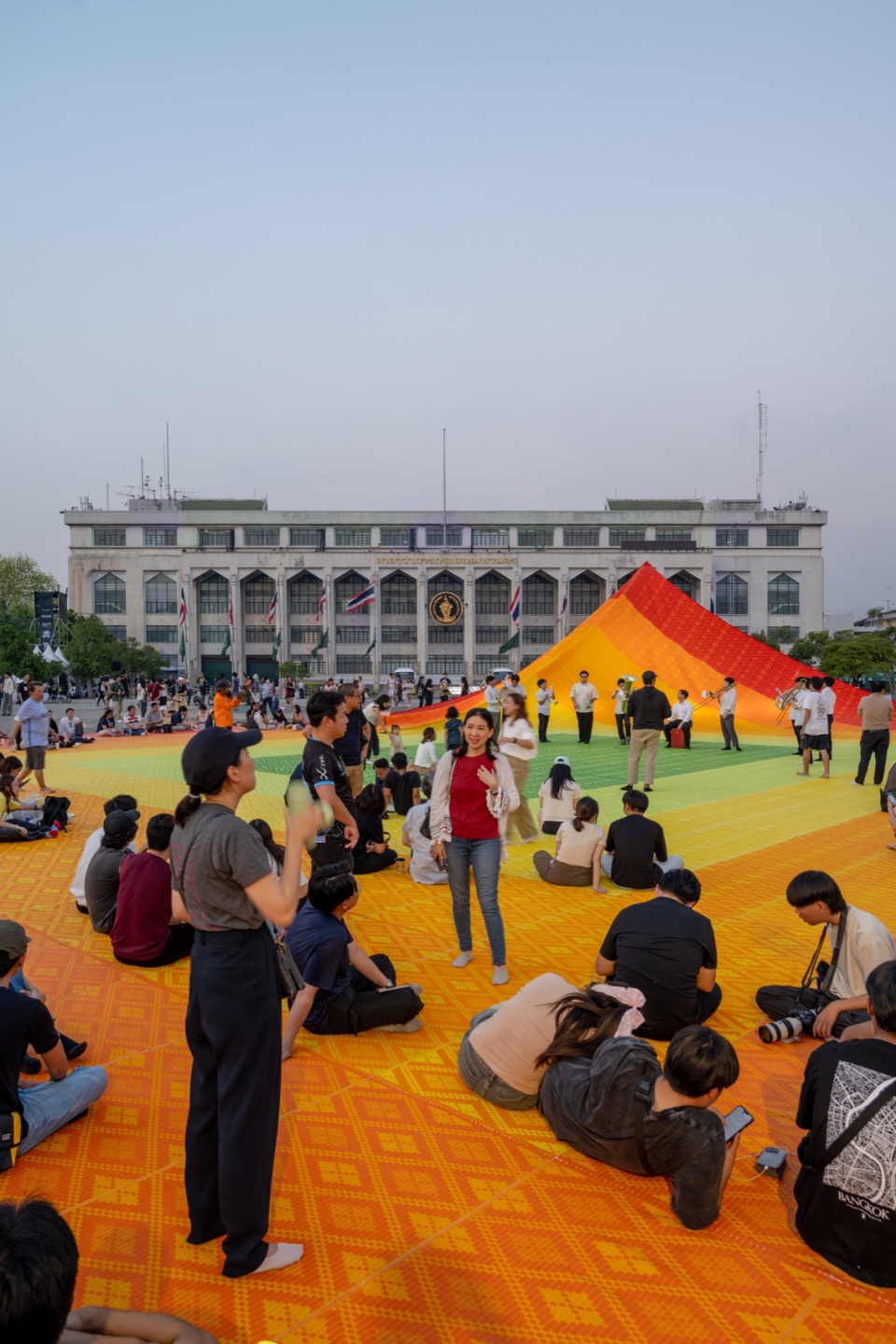 The bright colours of this Mega Mat form a gradient that serves as an infographic display of how plastic waste is currently disposed of in the country: red signifies the percentage of waste that is sent to unsanitary landfills; shades of orange represent the percentage that goes to sanitary landfills, with barriers in place that prevent ground pollution; yellow represents the percentage of waste that goes uncollected; while finally, the shades of green at the centre represent the percentage of plastic that is recycled. The colours, with their concentric arrangement, also reference the colourful roofs of the Wat Suthat Thepwararam, a temple located behind the plaza.