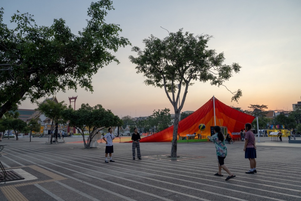 此外,Mega Mat在一角抬起,形成一个向上弯曲的曲面,这一设计再次呼应了素塔寺屋顶的曲线。这一空间下方形成了一处信息展示区,介绍泰国塑料废弃物与回收的现状,以及Mega Mat织入其中的环保理念。而装置的其余部分,则邀请市民自由使用,让Lan Khon Mueang广场成为他们的户外起居室。