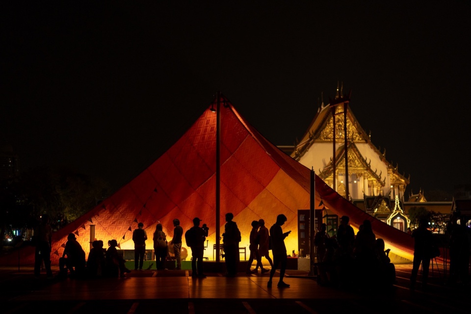 On one corner, the Mega Mat is lifted, with the upwards-curving shape again reminiscent of the roofs of the Wat Suthat Thepwararam. This sheltered corner provides a space to share information, where visitors can find an exhibition about the story of plastic waste and recycling in Thailand and the meaning woven into the recycled plastic of the Mega Mat, while the rest of the installation allows people to sit on and enjoy the Lan Khon Mueang plaza as their outdoor living room.