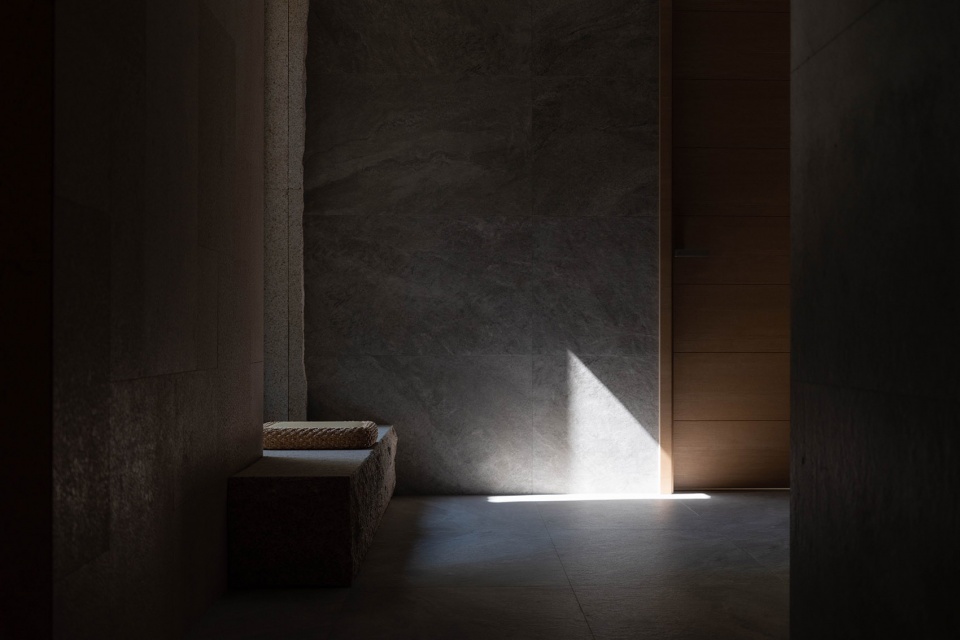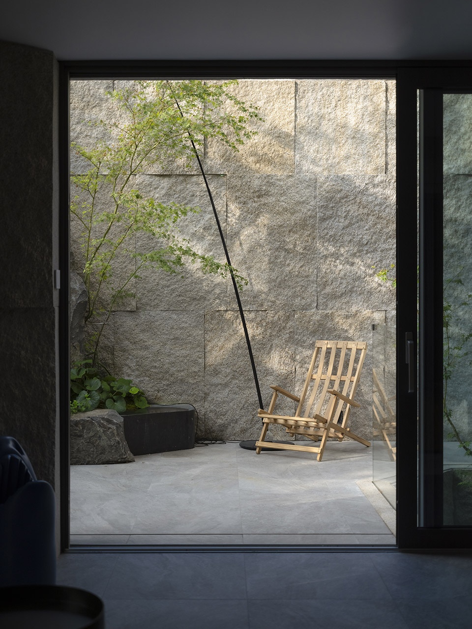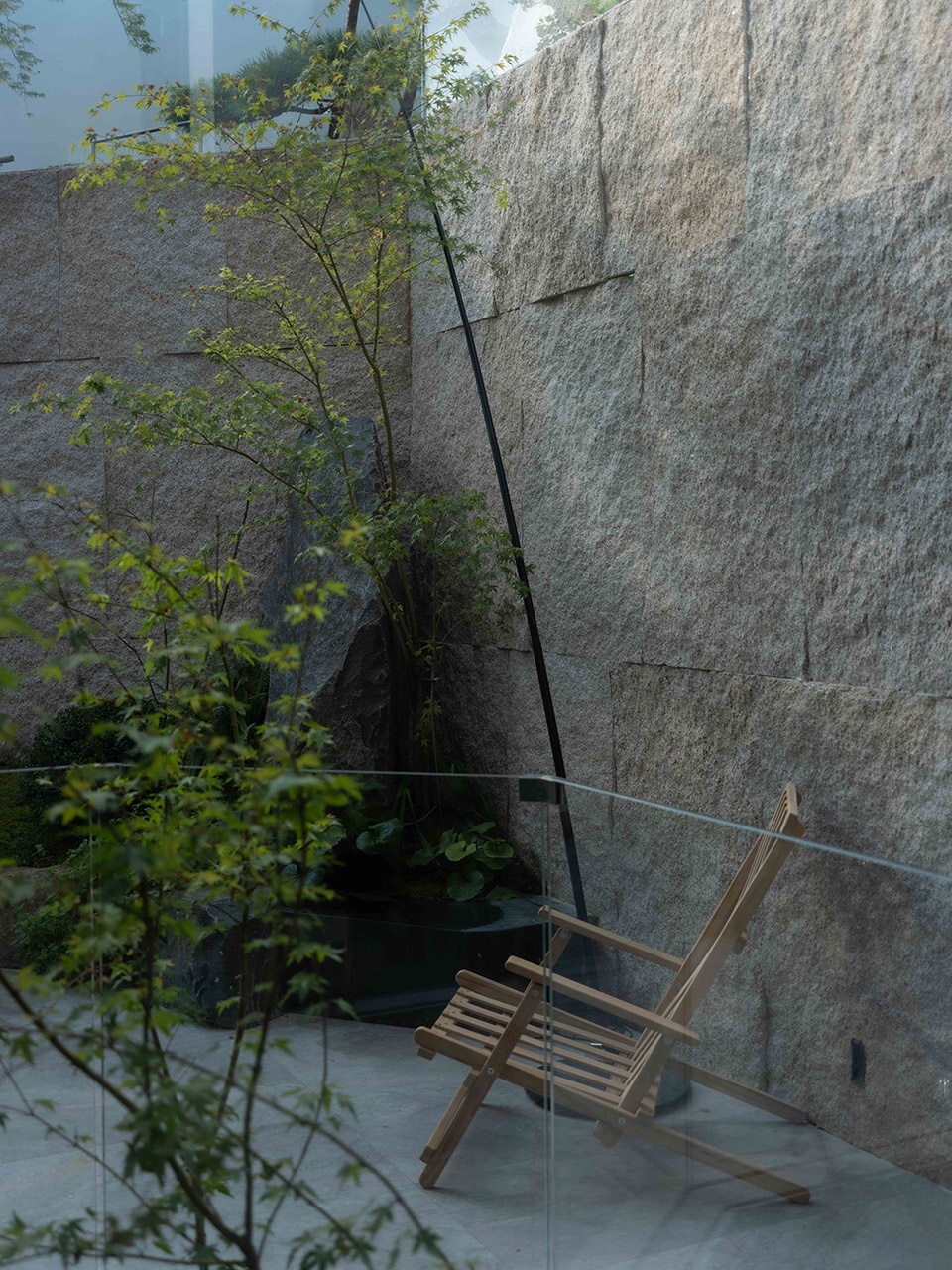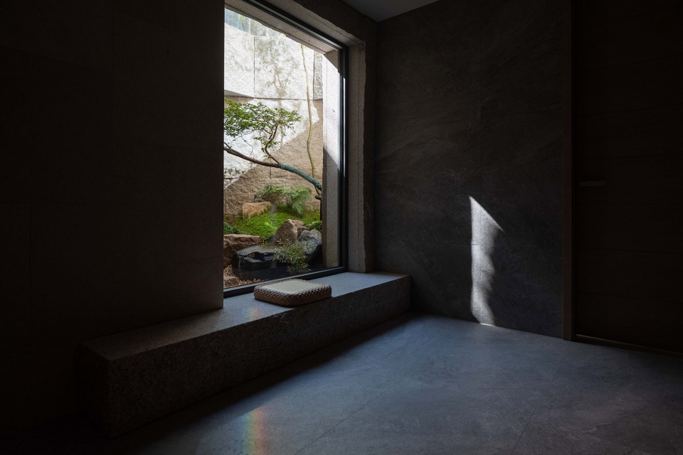 下沉花园的挡墙用自然面的花岗岩进行了处理,我们希望无论是从室内看向室外;或是进入到花园之中,都仿佛置身于自然,岩石墙面代替了山体岩壁,悬挑的楼梯从岩石峭壁中开凿而出,飘逸而青翠的植物在山石溪谷中舒展。
