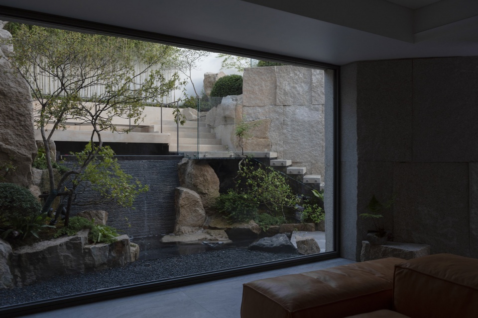 The main scene of the living room is set with a stream stacked stone, the tall stone is integrated with the rock wall, the building grows naturally from the mountain wall, the stream falls from the upper level into the main picture frame, the mountain stone and the plant echo.