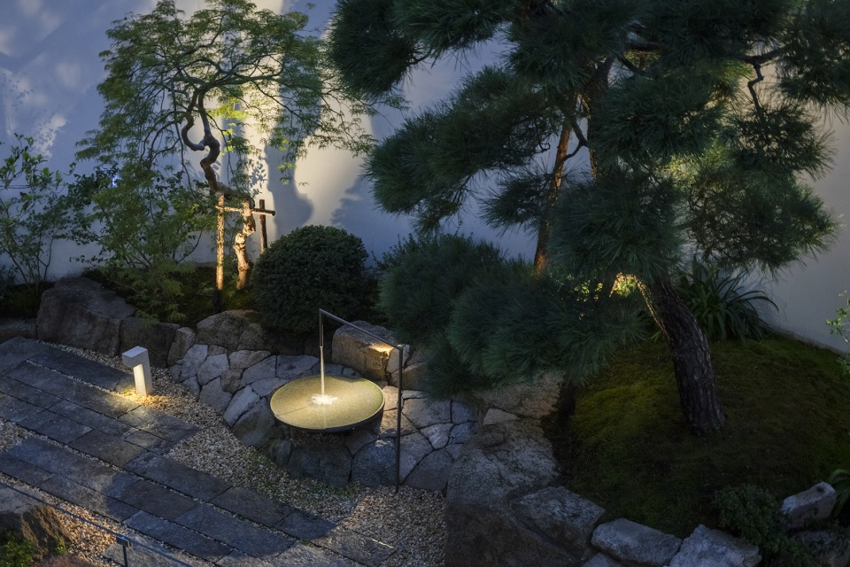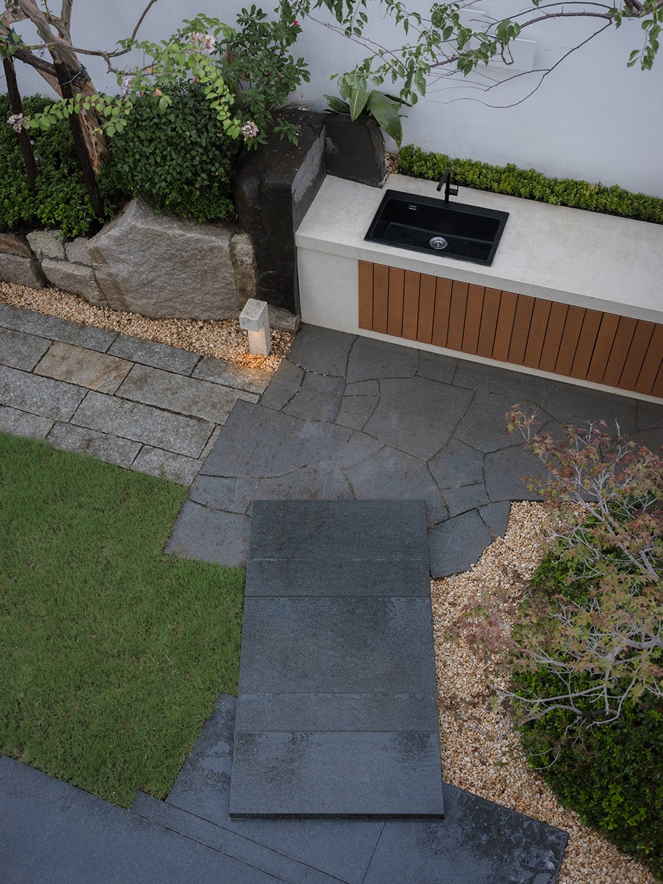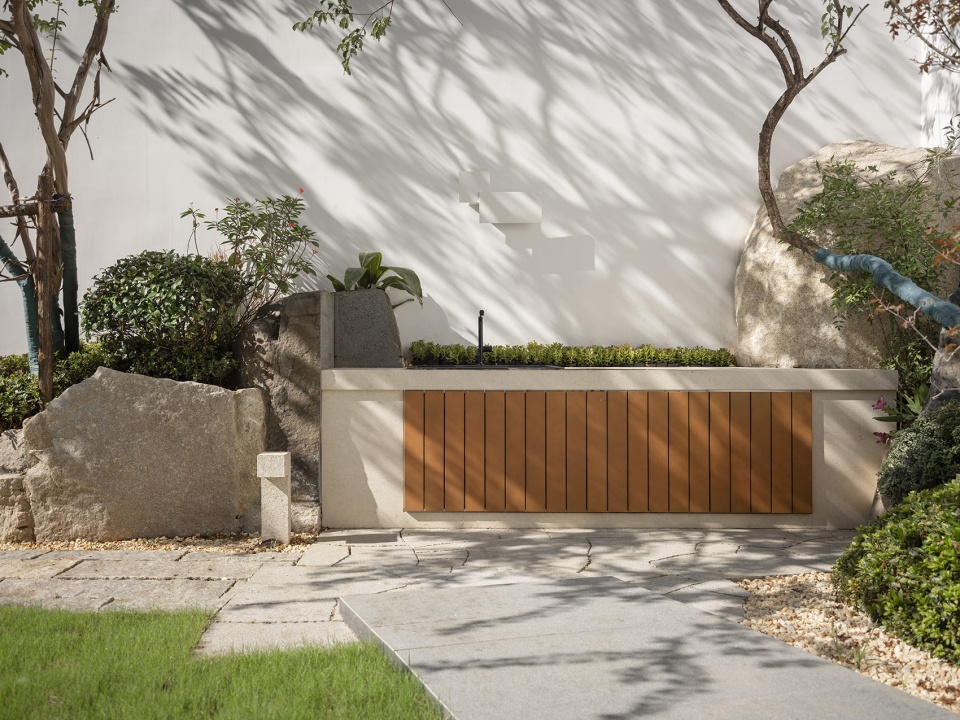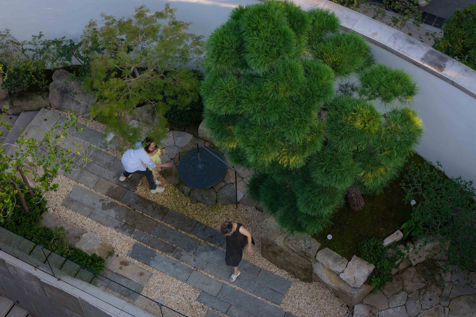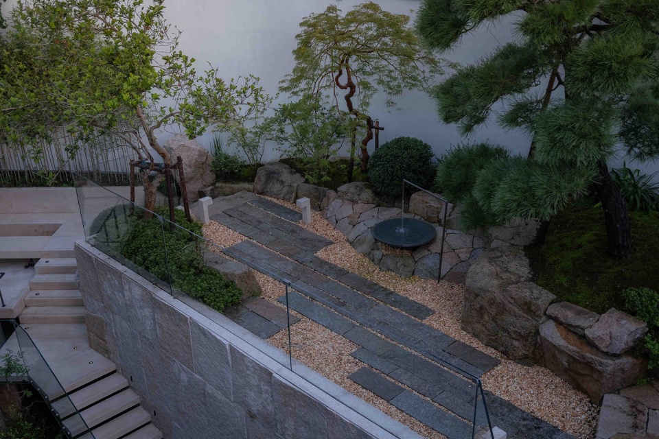 一层庭院的景观,在保证室内景观视角的前提下也兼顾了功能,设计了草坪空间和户外操作台,主要满足室外露营及儿童活动使用。自然的毛石堆砌树池,老石板的地面铺装,包括流水装置的设计,黑松,羽毛枫的搭配,整体以一种自然东方的风格与建筑融合。
