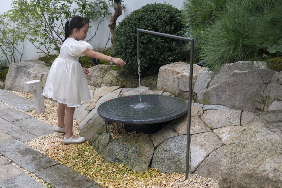 The landscape of the first floor courtyard, while ensuring the indoor landscape perspective, also takes into account the function of the design of lawn space and outdoor operating platform, mainly to meet the outdoor camping and children’s activities. The natural rubble pile tree pool, the old stone floor paving, including the design of the water device, the combination of black pine and feather maple, the whole is integrated with the building in a natural Oriental style.