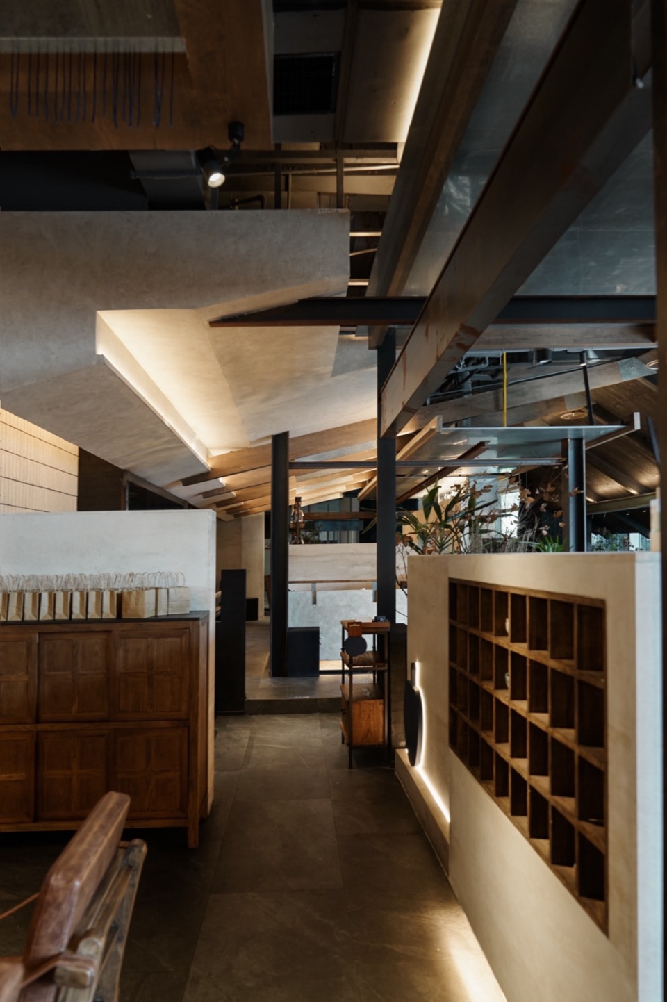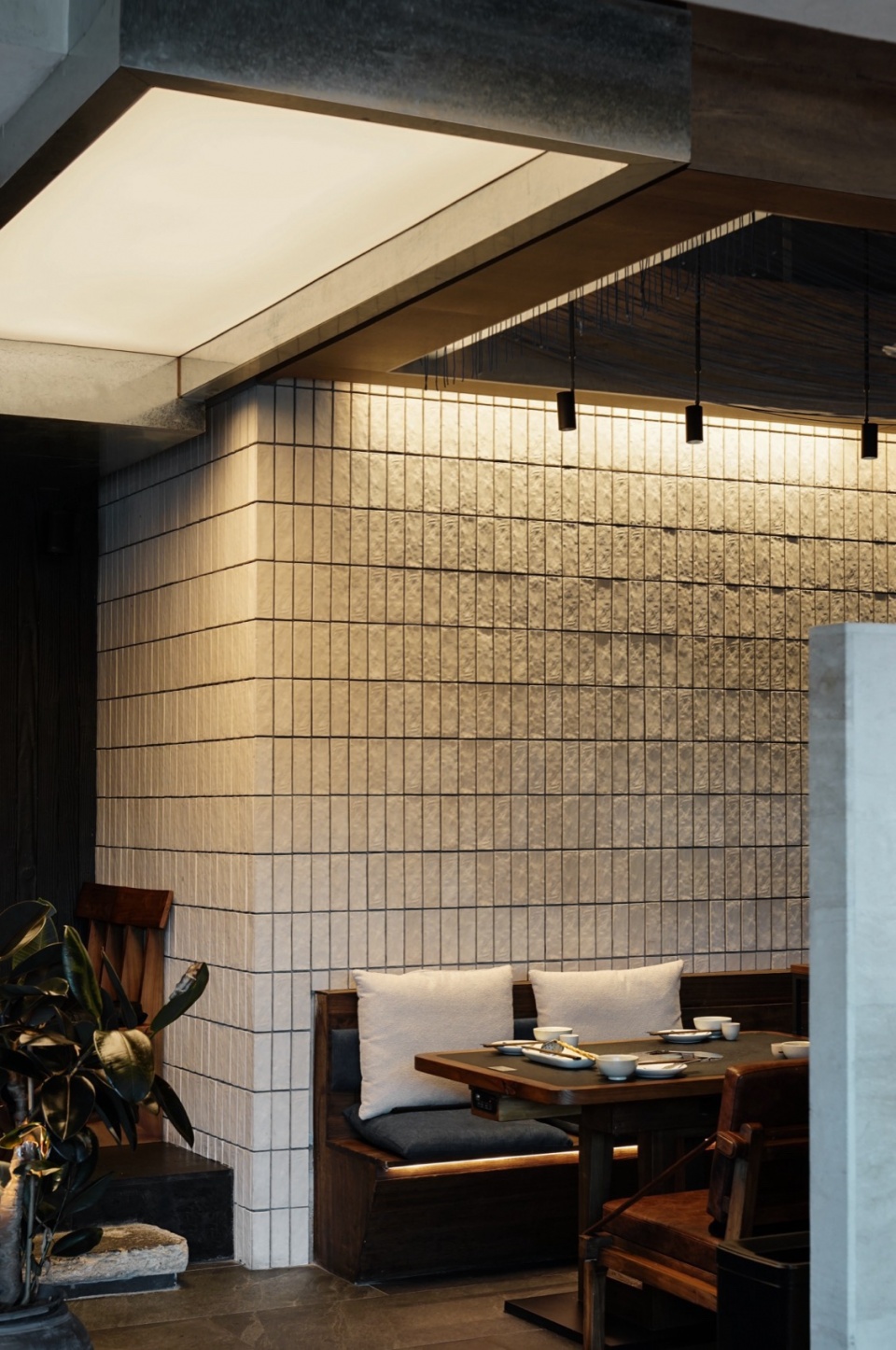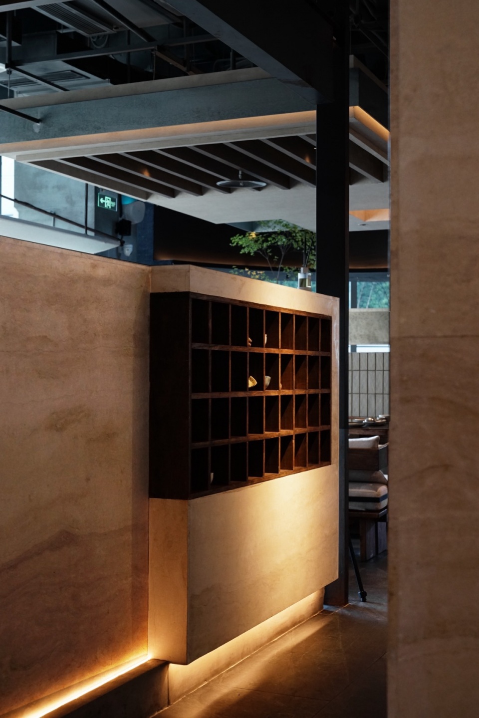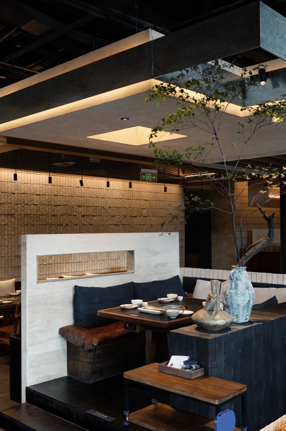 The space has been crafted to blend natural elements with enhanced comfort and relaxation. The staggered ceiling design disrupts the conventional monotony, introducing a dynamic rhythm to the space, while the rough and warm handmade wall surface captures the essence of nature with its unique texture.By utilising light and shadow as artistic mediums, the soft light of the morning mist filters through the fabric, guiding the viewer’s gaze through the space and highlighting the scattered greenery. The doorway falls down a huge blue fruit, showing the scene filled with the characteristics of your state, high and low staggered ground and brick wall, giving the space a rich sense of hierarchy, suspended ceiling and ground changes to match, creating a hilly scene in the interior .Wild nature is quietly reconciled with contemporary aesthetics.