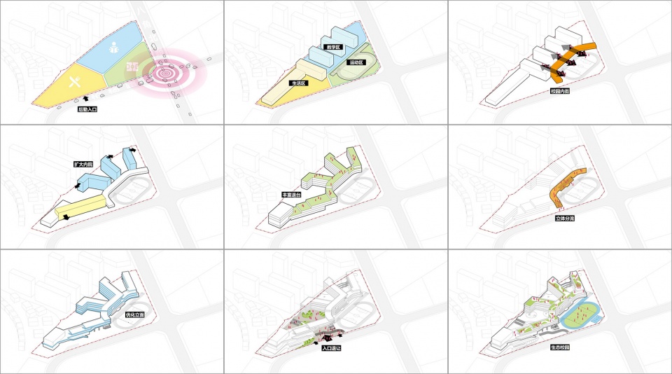 建设场地位于绵阳市八角北路与柏杨路的交叉口,大致呈三角形,八角北路为城市的次干道,直接与城市快速路相连,车流量较大。设计将运动场布置于道路十字交叉口处,有效拉开教学部分与交叉口距离,避免城市噪音影响,建筑的退让缓解了城市道路口的拥挤,不会对城市空间形成压迫;同时建筑布局与西侧原有城市肌理相呼应,形成西高东低的城市天际线。
