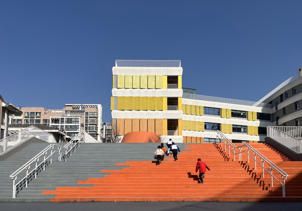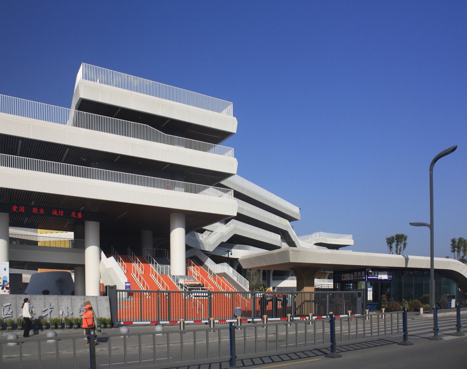Yingcai Primary School, situated in Mianyang Science and Technology City New District, Sichuan Province, is a newly established public institution designed to accommodate approximately 2,400 students. Occupying a triangular 24,000 m² site with 37,000 m² of built floor area, the campus is bordered by residential developments to the west and urban thoroughfares to the southeast and northeast. Its irregular geometry, stringent functional requirements, and dense urban context posed significant design challenges, positioning it as a flagship project for the district.