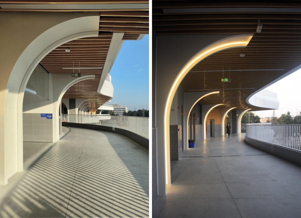 为了拓展学生的活动空间,我们用一条架空的“活力街道”串联教学部分和生活部分,使操场仍然可通过首层空间保持与教学院落的直接联系,形成立体的“街院”空间体系。活力街道通过拱券元素引导,形成如同柱廊般的序列空间,强化了其交通的主导性,夜幕降临,华灯初上,也是一番风景。