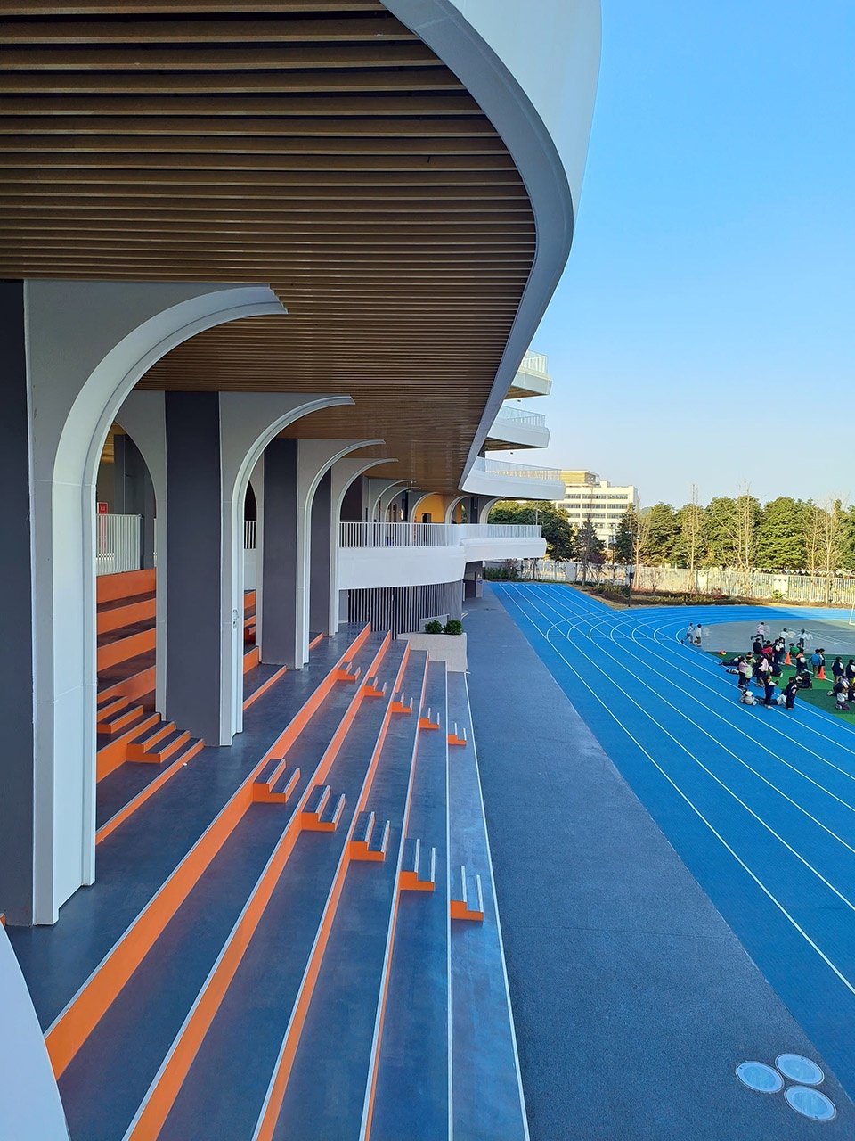Ground connections are achieved through entrance plazas with grand staircases and stadium-facing bleachers. This configuration enables multi-level ingress/egress to alleviate peak-hour congestion while providing expedited access between upper floors and athletic facilities. The bleacher-stair hybrid doubles as an informal gathering space, fostering student engagement.