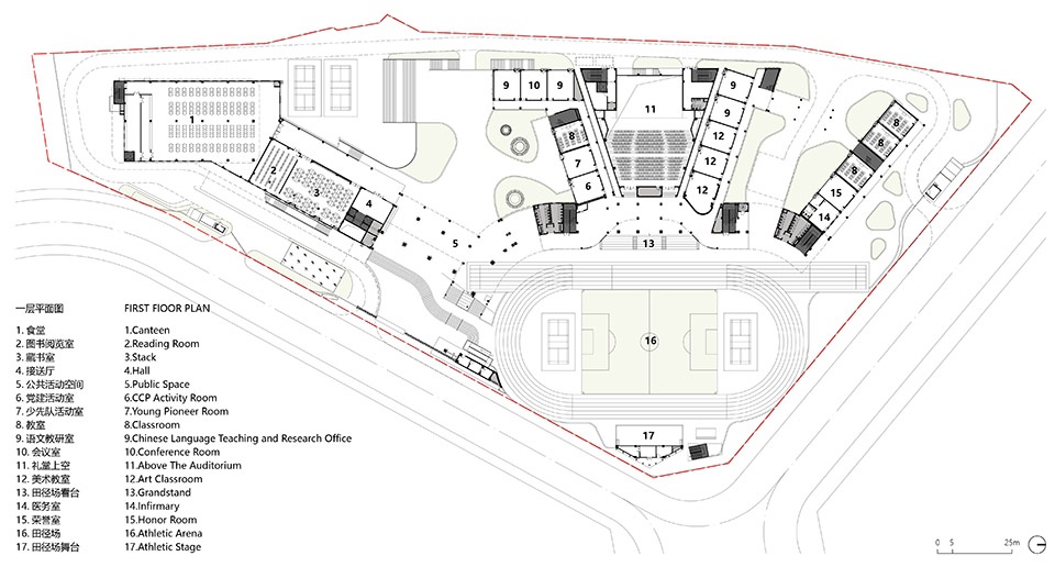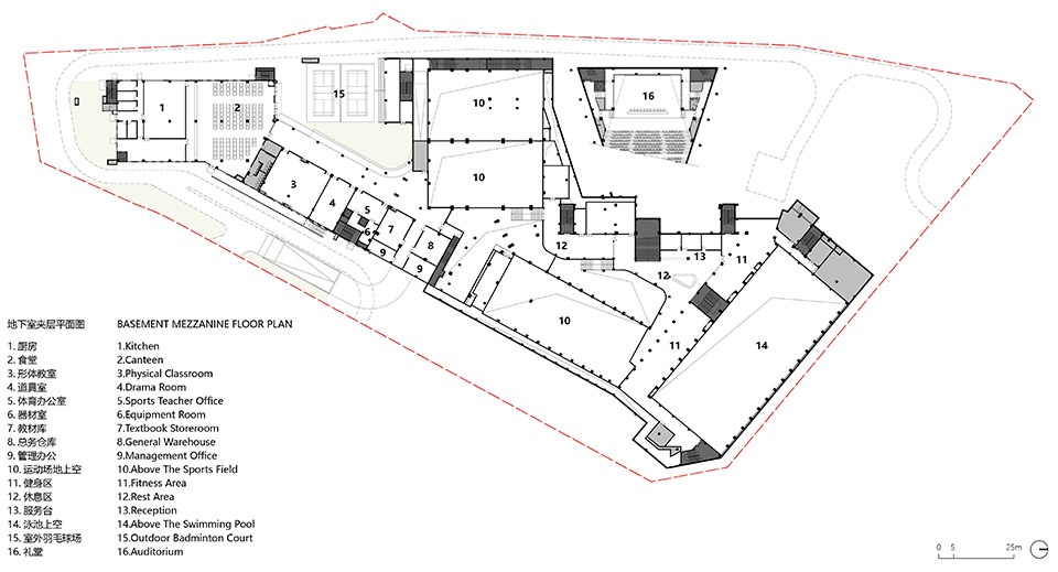 全面的功能需求与有限的项目用地之间的协调,成为了本次设计的最大挑战。由于对建筑覆盖率的严格限制,我们必须采用向上向下拓展空间的方式。向上拓展风雨操场、劳动园地,向下拓展恒温泳池、标准篮球场及羽毛球场。同时顺应场地高差设置吊层,以保证地下运动场地的通风与采光。