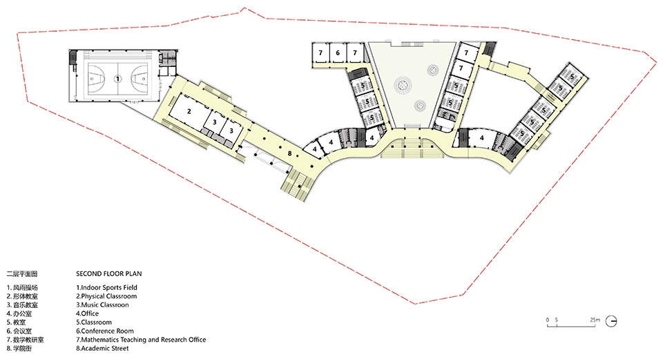 The site is situated at the intersection of Bajiao North Road and Baiyang Road in Mianyang City, characterized by a roughly triangular footprint. Bajiao North Road, functioning as a secondary urban arterial, directly links to the city’s expressway and accommodates high traffic volumes. In response to the context, the design strategically locates the sports field at the road junction. This configuration establishes a buffer between the educational facilities and the intersection, mitigating noise disruption from urban traffic. The building’s setback further alleviates congestion at the crossroads while maintaining a harmonious relationship with the surrounding urban fabric, avoiding visual or spatial encroachment. Additionally, the architectural massing aligns with the existing urban grain to the west, creating a graduated skyline that slopes downward from west to east, reinforcing the area’s contextual continuity.