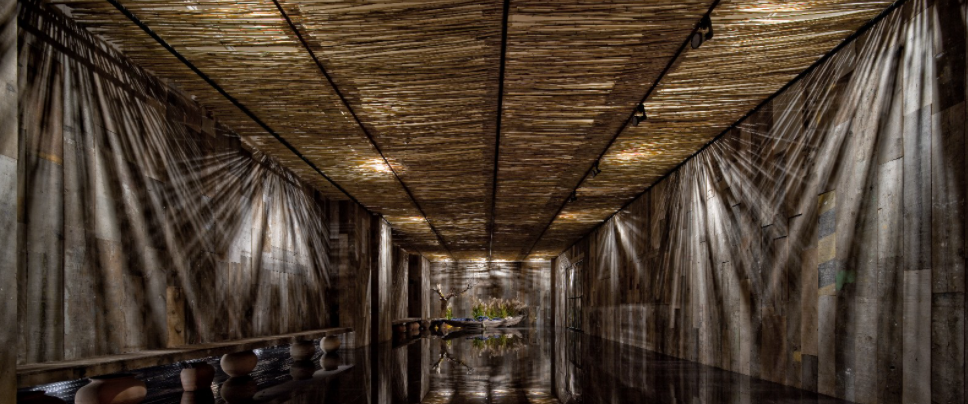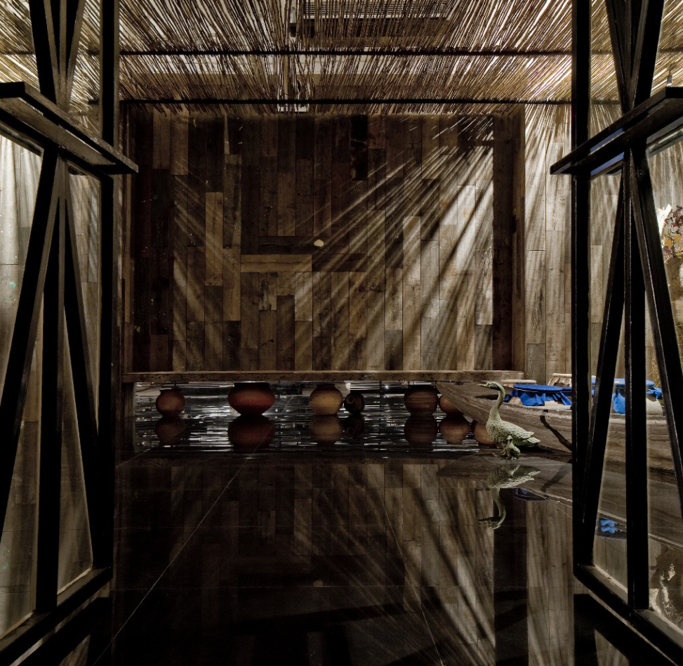 主要材料:黑色亮光面地砖、瓦片、旧木板、干细竹,黑色金属管等