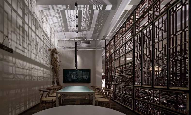 会议室的隔断依然采用的是环保二手镂空木质门窗,不规则的排列,却又整齐划一的形成了一面半开放式的墙面,设计师们的方案讨论区,既严谨又不失格局,既随意又认真。
