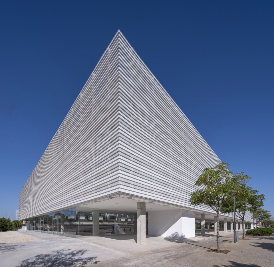 The facades of the building are configured as a dynamic system in permanent change, in which the superposition of two different geometries, horizontal striping on the exterior leaf and checkerboard on the interior leaf, alternate with greater or lesser intensity depending on the nuances of the interior and exterior lighting. These changes in the composition of the façade are reinforced by the alternation between the intense white color of the façade during the day and its decomposition into the different blue colors that arise from the reflection of the lighting on the interior floors of the building.