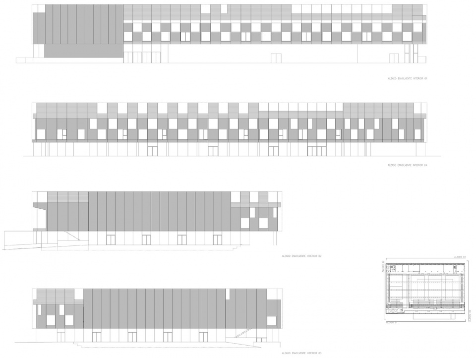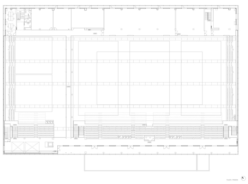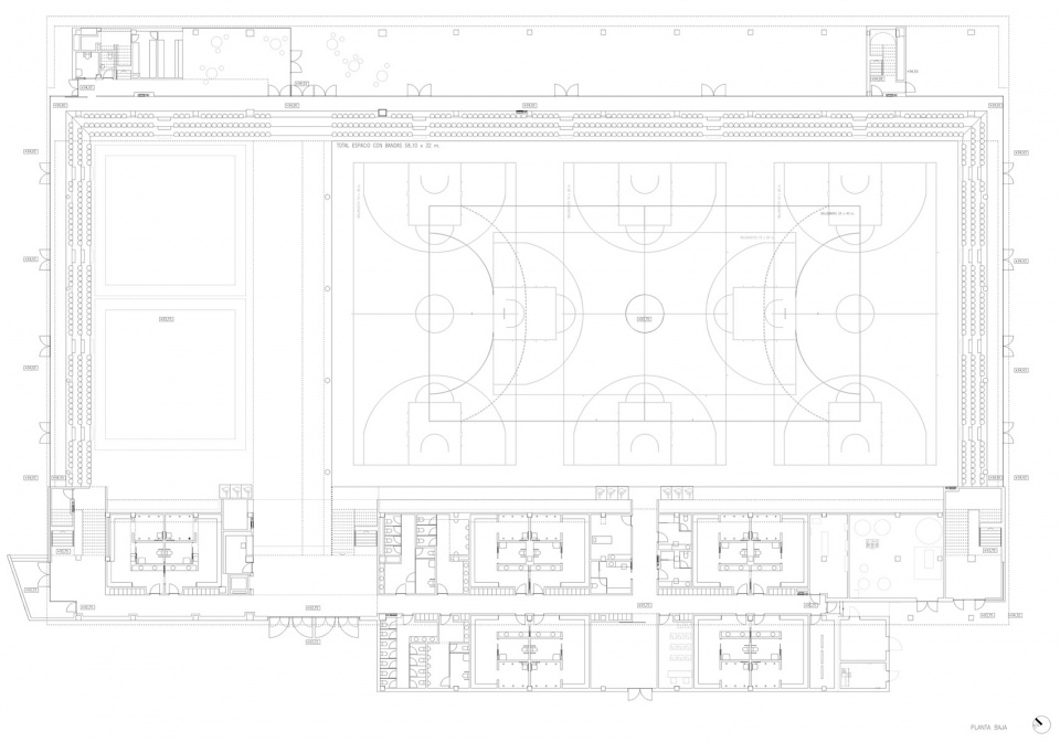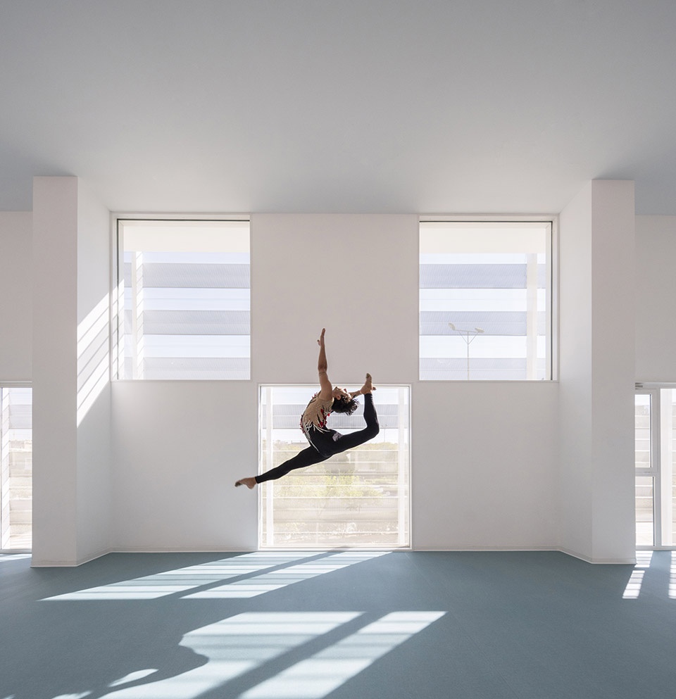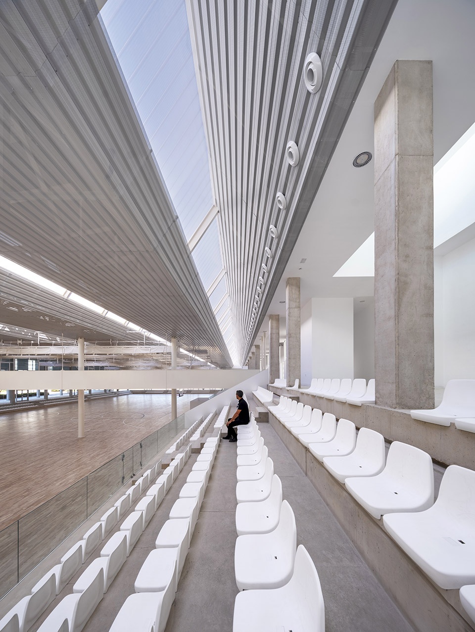 To achieve the greatest degree of versatility of its spaces, the different sports modalities are grouped in two large spaces: on the one hand, the central space intended for team sports modalities and with the equivalent capacity of 4 indoor basketball courts and, on the other, room spaces for directed activities and gyms. Each of these interior spaces will be characterized by different nuances of light and color: the central space, overhead lighting through 5 skylights facing North and with a predominance of the warm tones of the wood of the flooring; the activity rooms, through illumination filtered through the two sheets of the facades and the different cold tones of its floors.