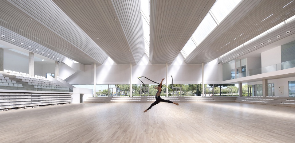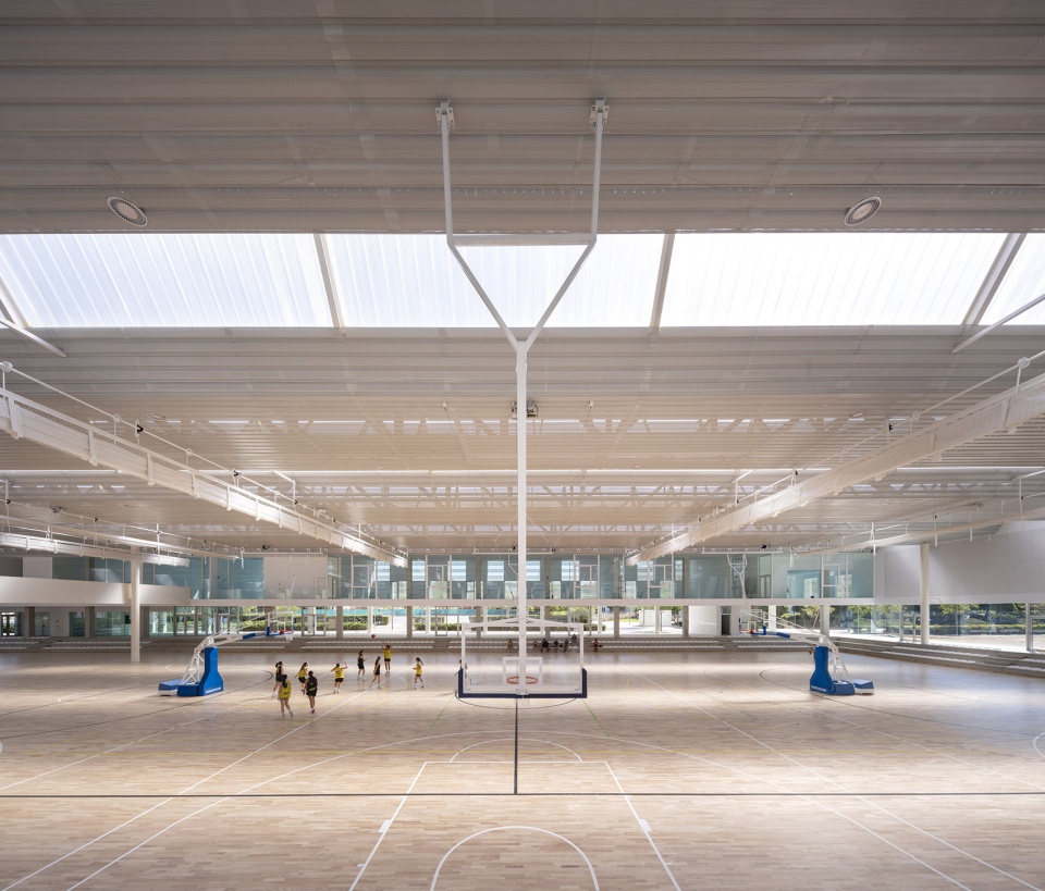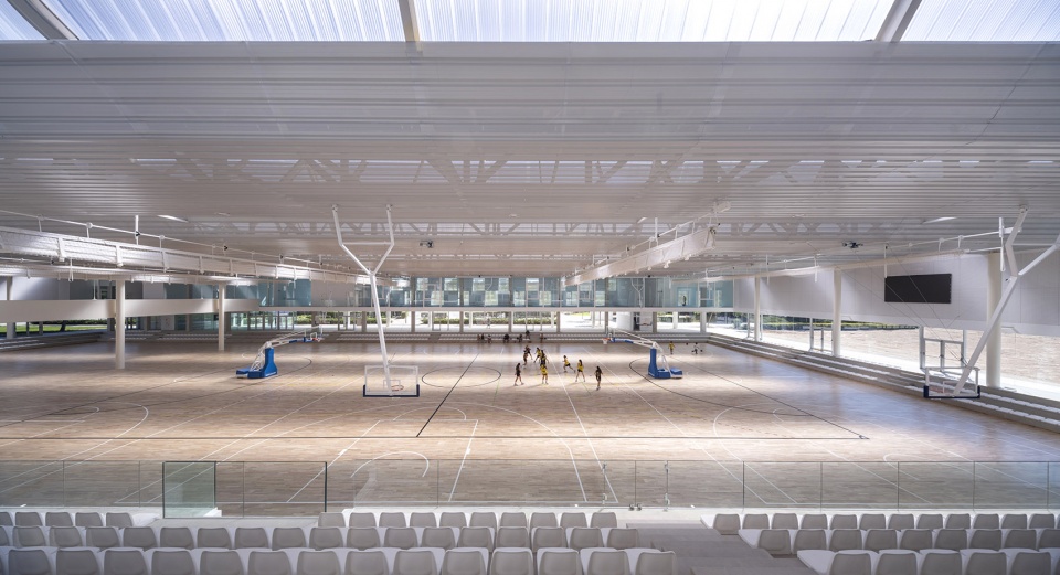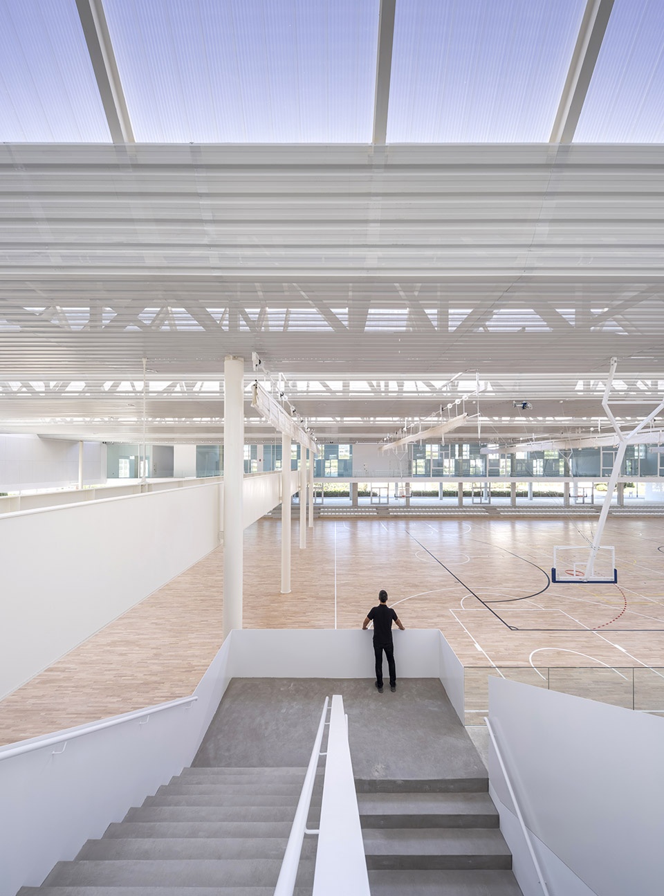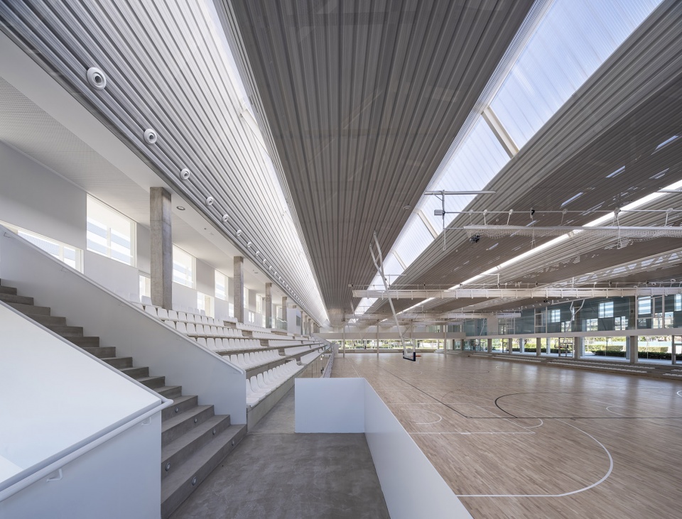 为了实现空间的最大灵活性,不同的体育项目被分为两个大型空间:一方面是中央区域,适用于团体运动项目,容量相当于4个室内篮球场;另一方面是用于定向活动和健身的房间。每个室内空间将以不同的光线和色彩特色为特征:中央空间通过5个北向天窗提供顶光,地板木材的温暖色调占主导;活动室则通过两层立面的光线过滤,并呈现不同的冷色调地板。