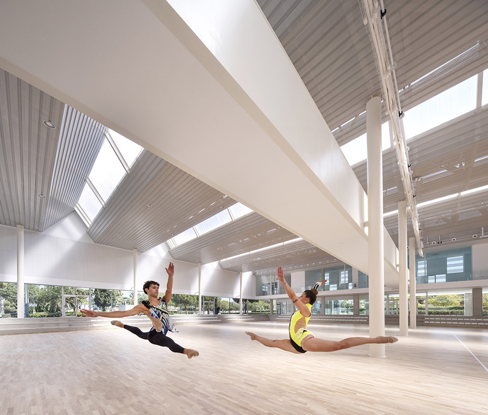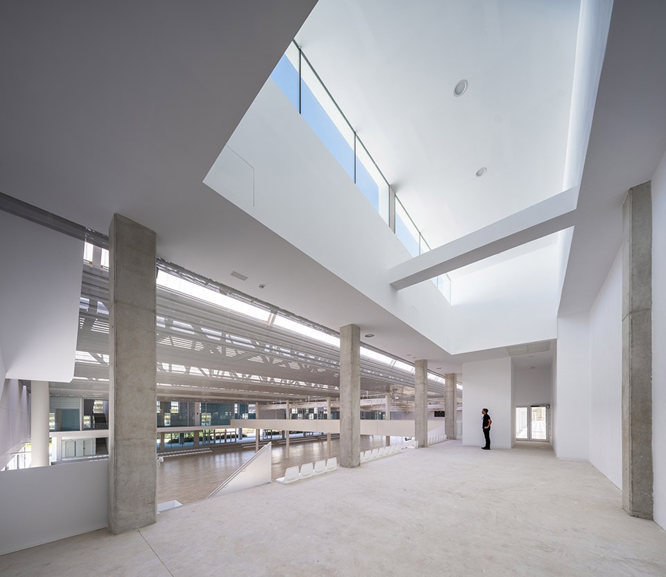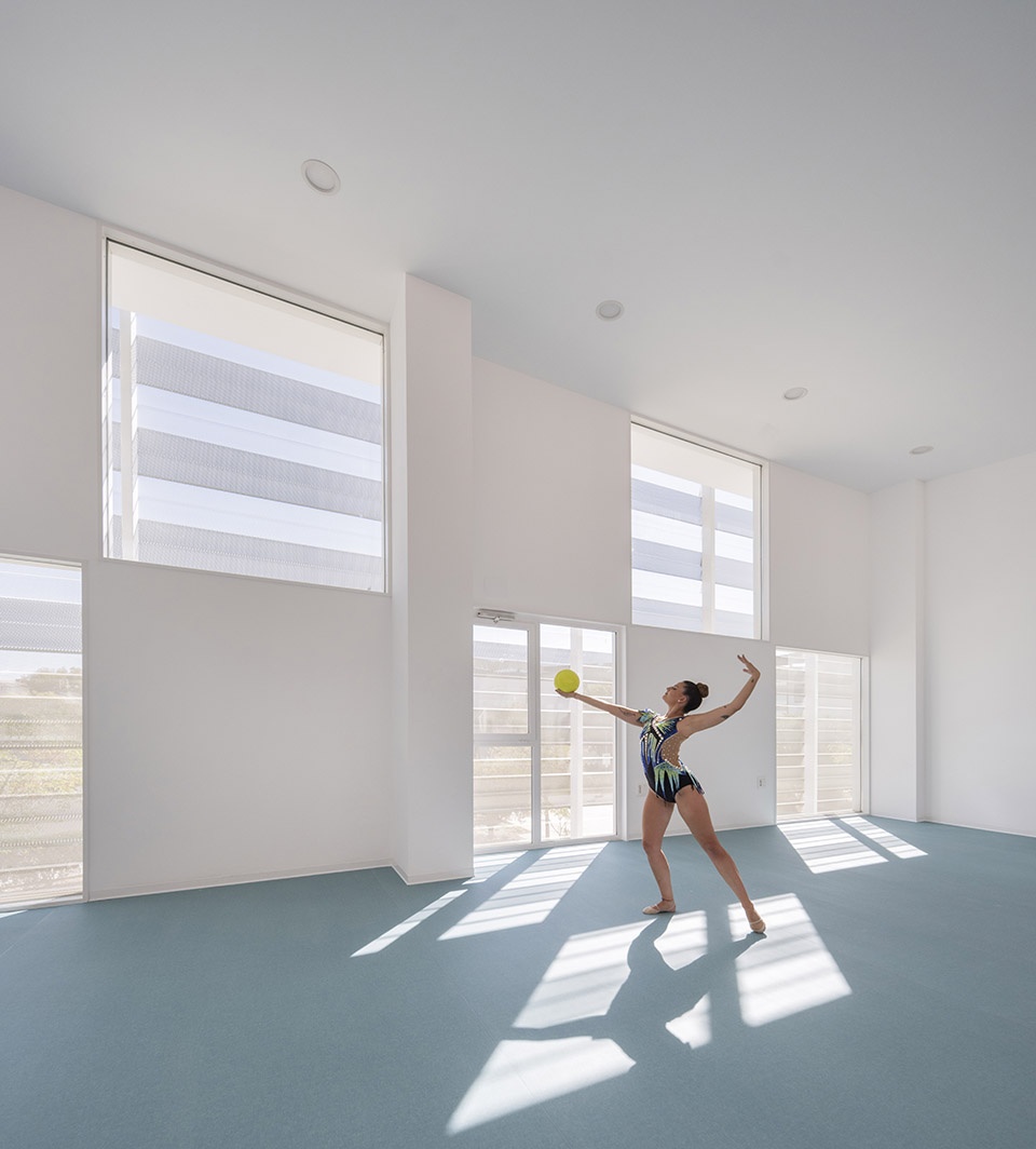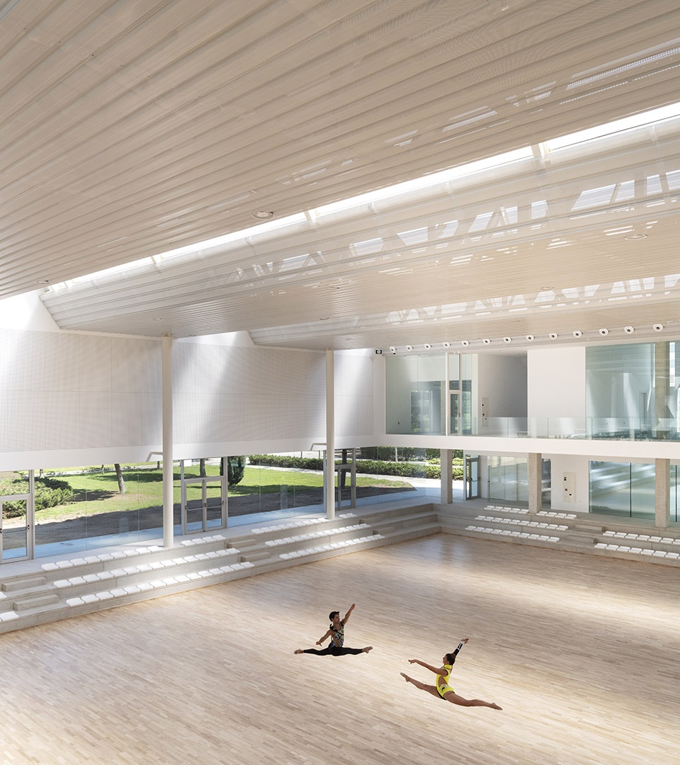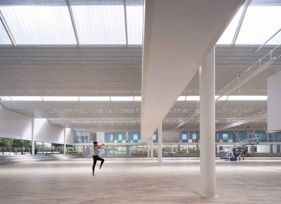 为了实现空间的最大灵活性,不同的体育项目被分为两个大型空间:一方面是中央区域,适用于团体运动项目,容量相当于4个室内篮球场;另一方面是用于定向活动和健身的房间。每个室内空间将以不同的光线和色彩特色为特征:中央空间通过5个北向天窗提供顶光,地板木材的温暖色调占主导;活动室则通过两层立面的光线过滤,并呈现不同的冷色调地板。