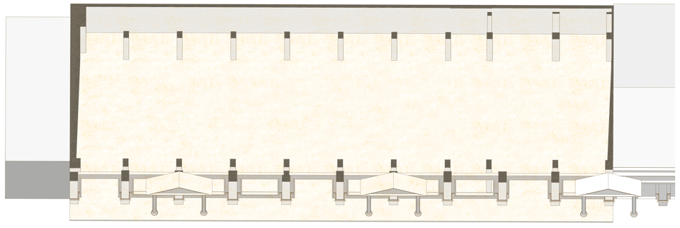 ▼长达9个柱跨的店铺外立面,Store’s Long Façade with 9 Column Spans