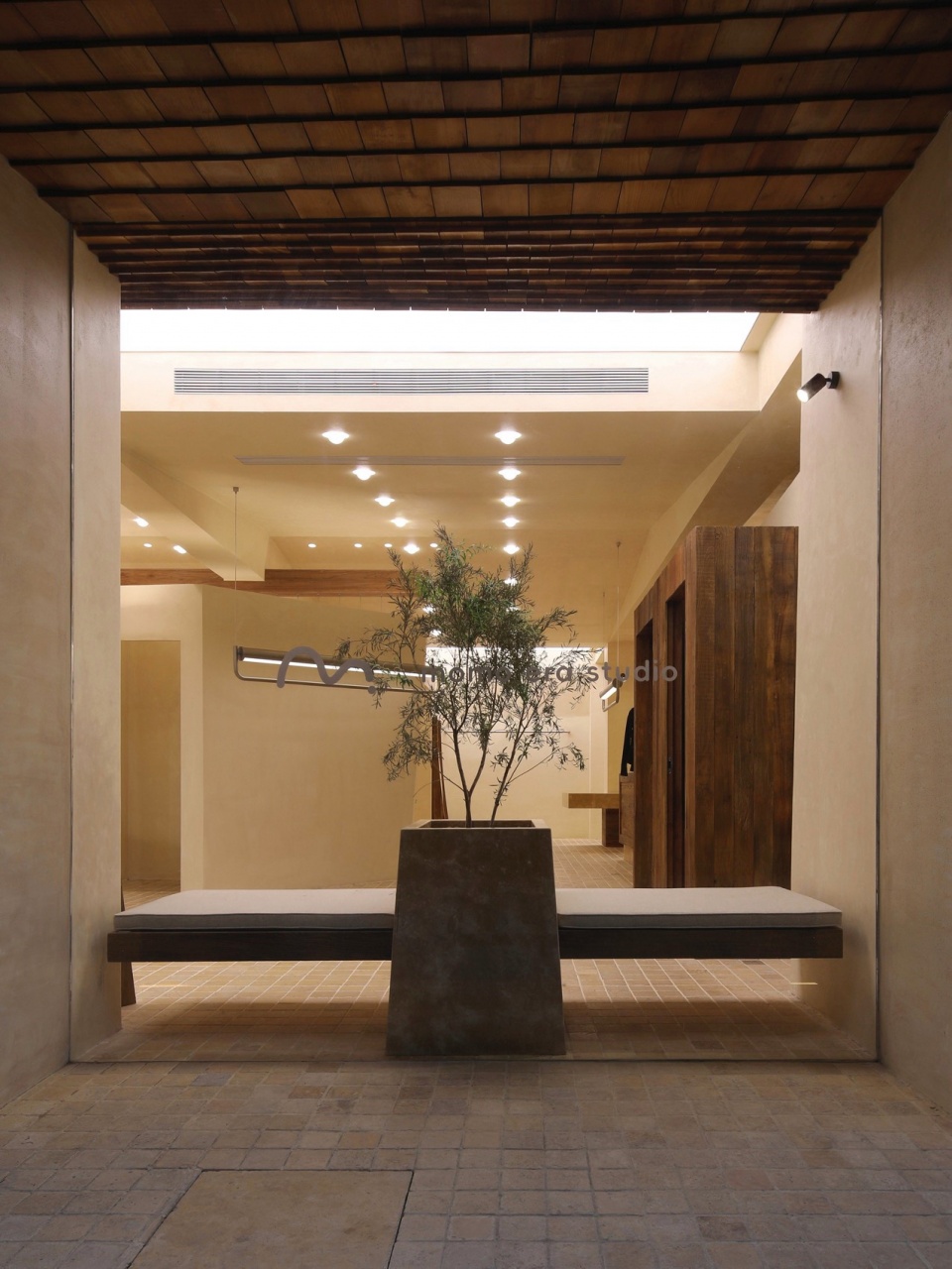 到来、游走、选购、落座,为身体选择当下遮体的服饰,让心灵在此也得到片刻的遮盖,这是我们期待的空间所能体现的设计诉求。场地是沿园区内部主向道路展开的一座单体建筑,整体立面在早期园区第一次的改造中,稳重均质的混凝土梁柱体系被欧式造型装饰刻意地隐藏了起来。拆除附赘的装饰,显露在我们面前的是建筑结构原本真实的面貌,每隔三米一品的柱跨均质地连接起九个立面洞口,并托起了一个10米*30米微微隆起的人字坡顶,一个大屋子的意向顿时映射在空间内。为了能让人来到建筑前就感受到屋子的形象,我们需要赋予在建筑立面上一个新的屋顶——它带来了一条屋前的长廊,人从两端走来时,屋顶微微起翘,接近入口时,一反通常的店铺门面放大扩张的处理,它又平缓下躺,似乎有意遮掩内部熟客的热络,又似乎是要拉进距离,体贴你。附在其上的红雪松木瓦鳞次栉比地顺着曲面屋顶一路爬进了室内,在结束于空间高处的位置,人造天光从上洒下,浇淋在每片不同角度的木瓦面上,光影、形态在建筑柱廊间舒展、隐现,至此,屋子有了一个正面的形象。