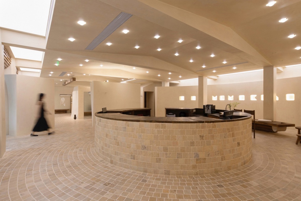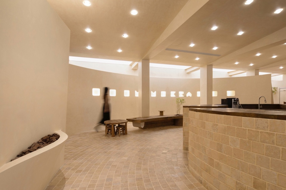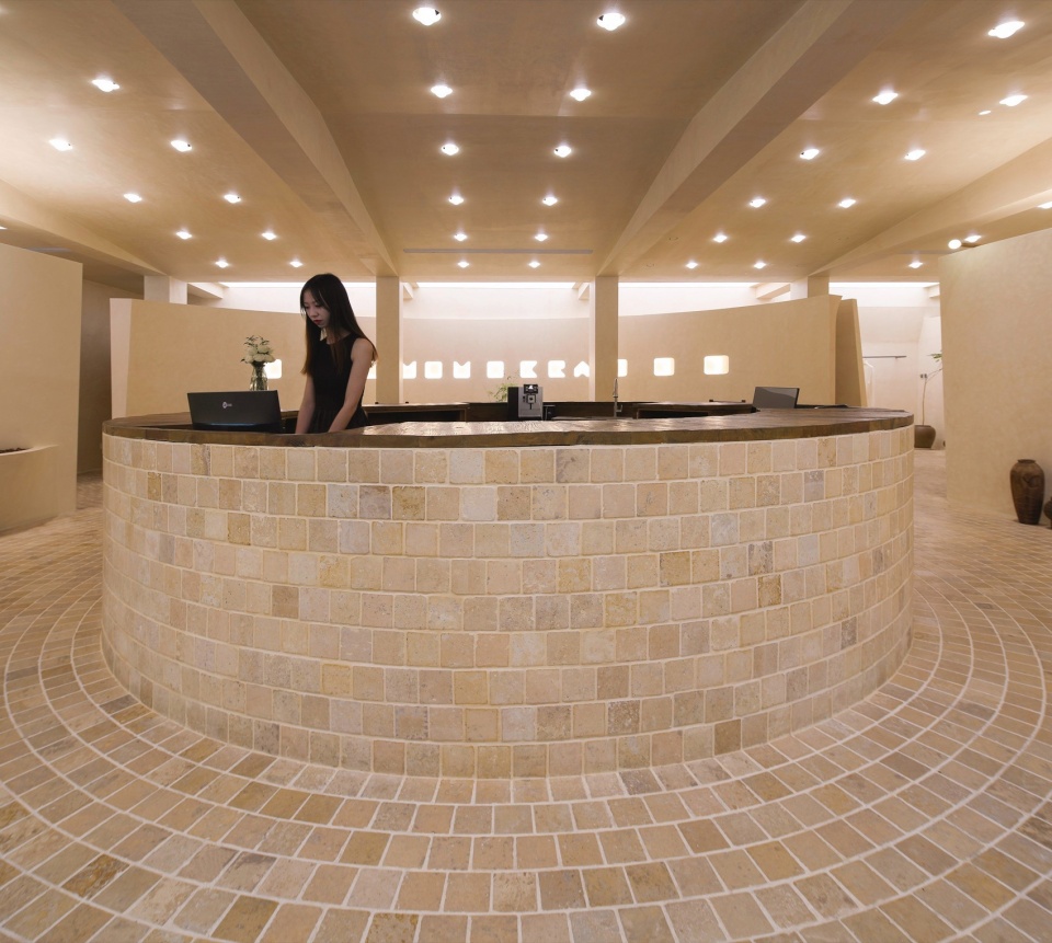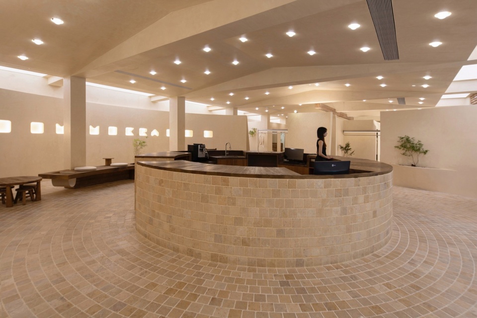 In terms of material selection, we sought to replace large-scale materials with smaller, older ones to reflect the family-oriented essence of the house. The floor is not laid with large tiles, but with 10×10 cm small blocks of lime stone, arranged radially from the center of the “inner courtyard.” These stones extend upwards along the walls at the edge of the circular cashier desk. The furniture, which directly interacts with people, is made from old elm wood slats salvaged from old door panels. These slats have been reassembled, cut, and painted to give them new functional meaning. The overall paint finish of the space is applied in a rubbing technique, leaving a mottled trace of age on the surfaces. Rather than using typical commercial lighting, we handcrafted spherical lights, partially embedded into the ceiling, hiding the fixtures and creating a floating light source that adds a fresh touch to the space.