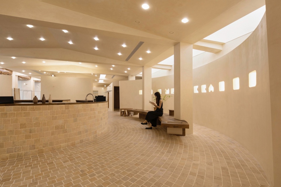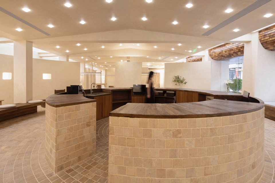 随着空间向内展开的是位于中央的前厅“内院”,圆形中岛收银台在此既是室内迎客的流线起点,也是选购的终点。两侧的陈列区入口墙面像泥塑般地拿捏糅合后,在互相映衬下谦逊地围绕着中岛前行显现。整个弧形背景面沿居中线向两侧从原墙面上逐渐分离出,又向中岛区缓缓收拢,模拟品牌字形的几何壁龛安静地嵌入其上,没有多余的装饰,瞩目、却不张扬。来此,无论是采买还是休息,“内院”总以包容的姿态等待着每一位客人。