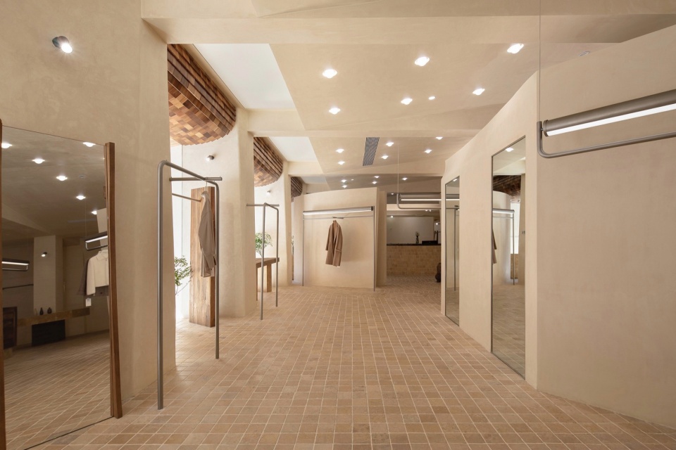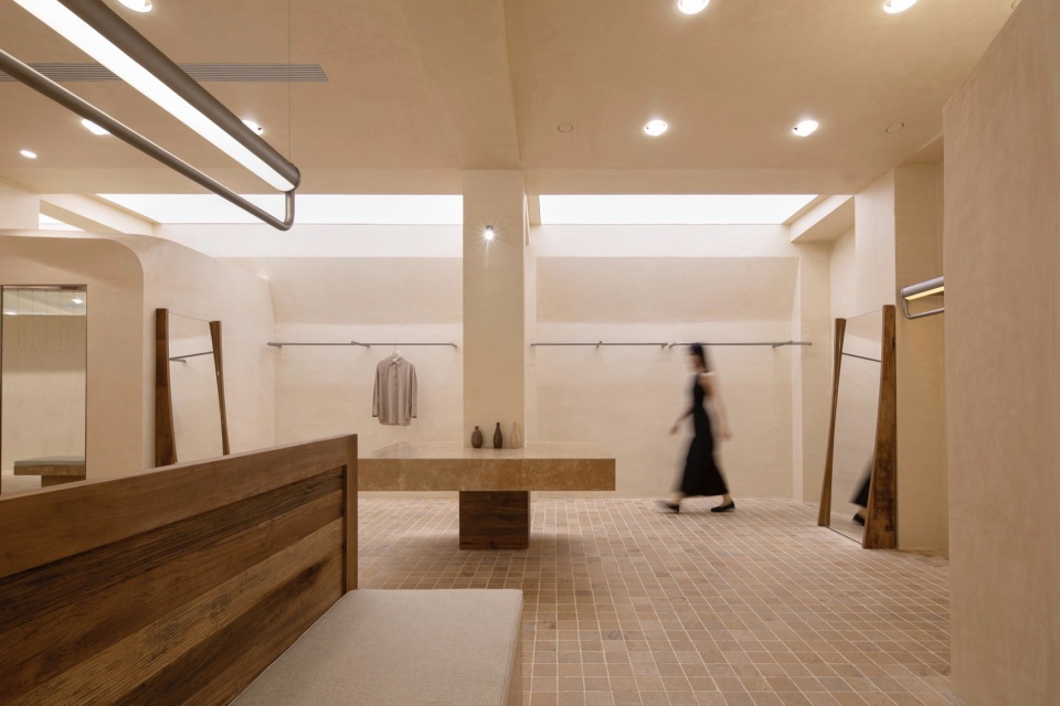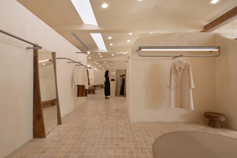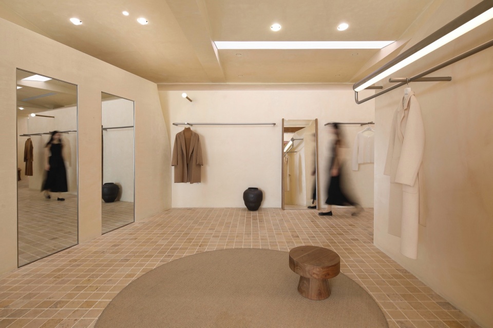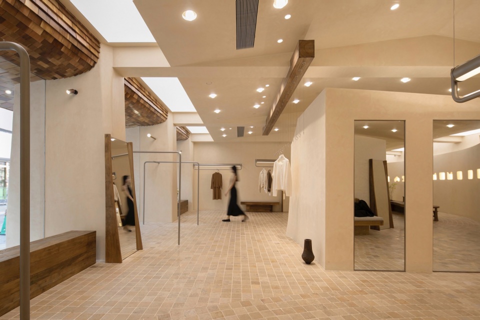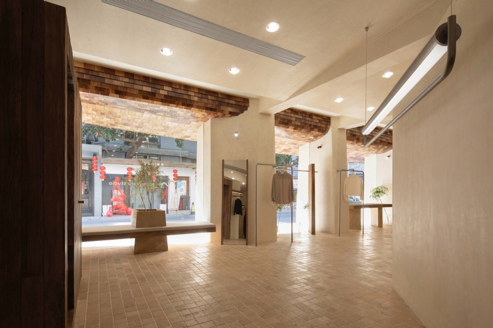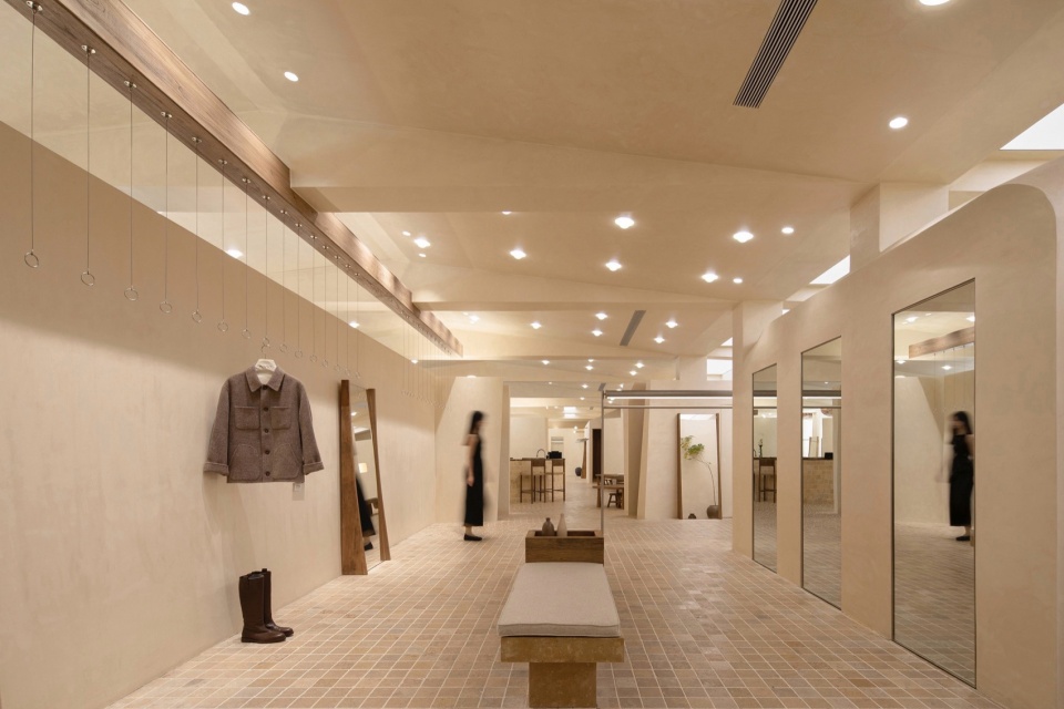 We tried to harmonize the objective factors and needs of the project, ensuring they found an appropriate way to coexist. The thickened corridor columns were a result of the difference in dimensions between the original structure’s inner and outer columns. The newly shaped, tapered columns, after being polished, have a warm, antique texture. The “wooden beams” suspended from the ceiling were designed to accommodate the installation of garment hangers. They interlock with modern concrete beams using traditional methods, thus recalling a fragment of the memory of past wooden beams. The sloped ceiling, close to the structural beams, was created to avoid the air conditioning pipes above, resulting in a continuous, unbroken gabled roof. Therefore, from a construction perspective, we did not physically build an entire house, but once a customer rests and looks around, following the contours of the space, perhaps in a fleeting moment, this “non-built” house echoes another house once visited—a place of shelter under a low, sloped roof, where we once paused and instinctively pulled down the collar of our clothes, reconnecting with familiar memories.