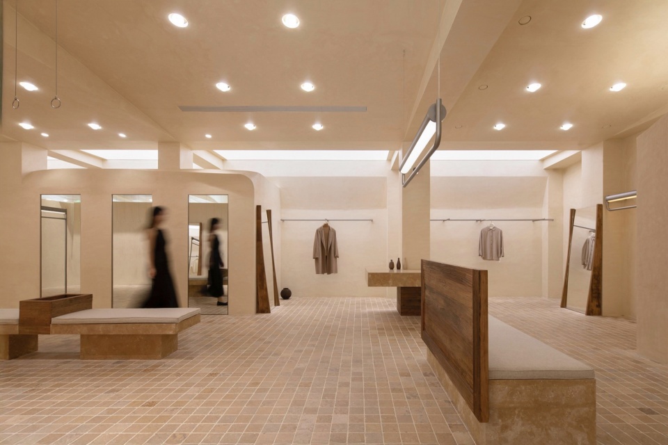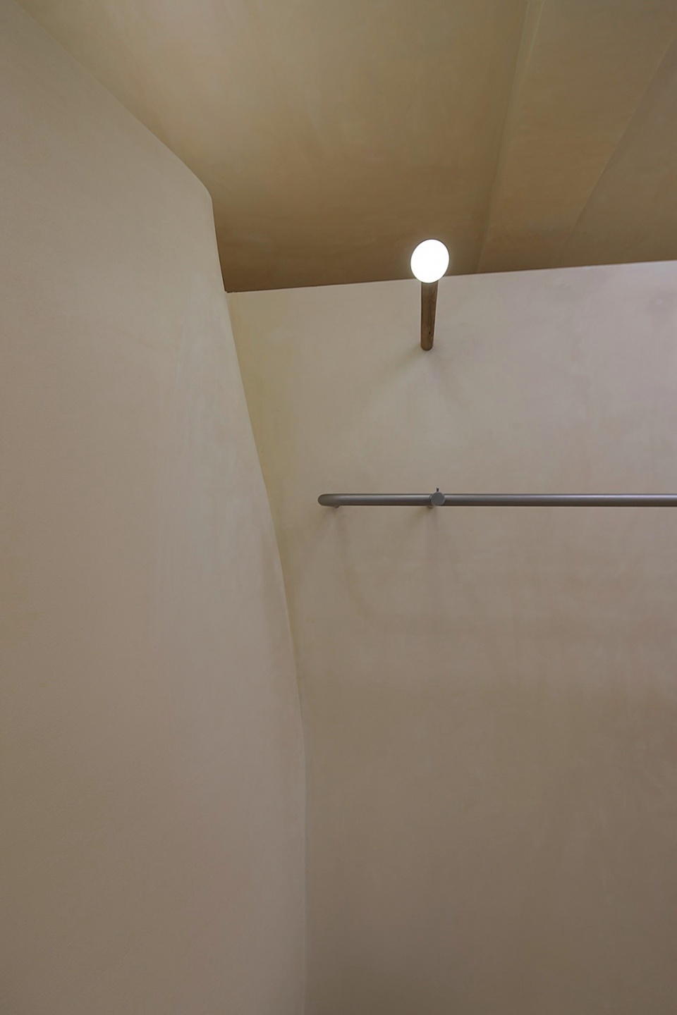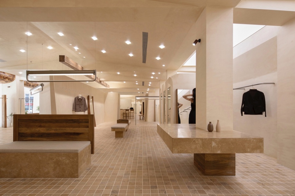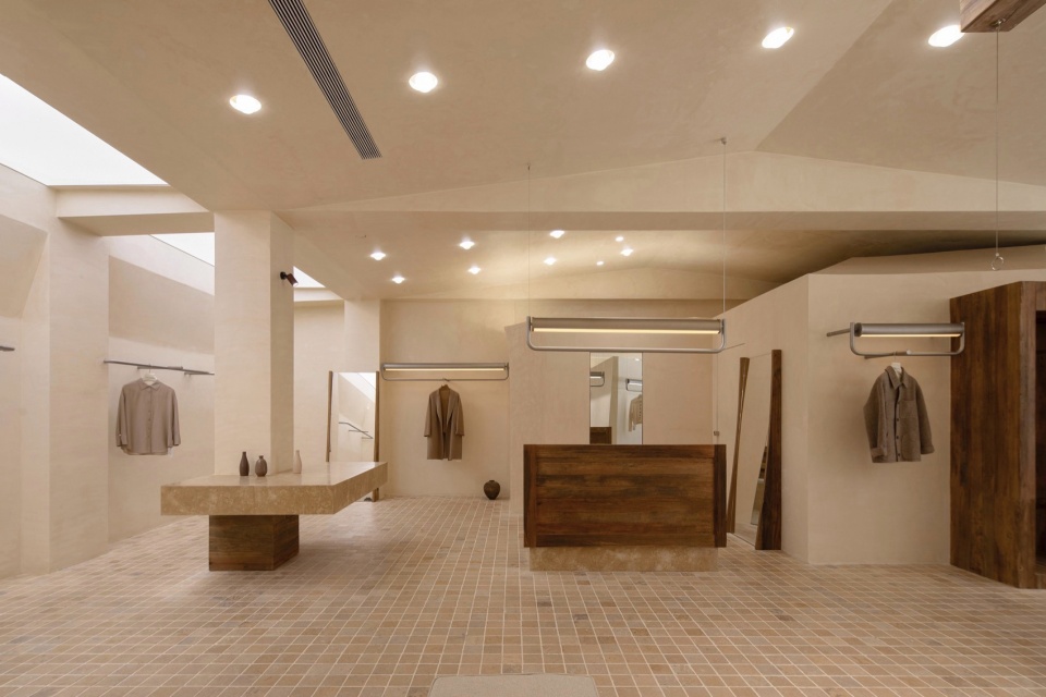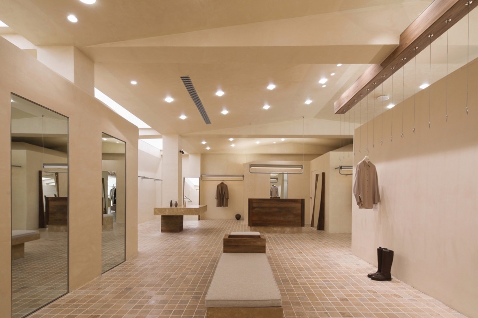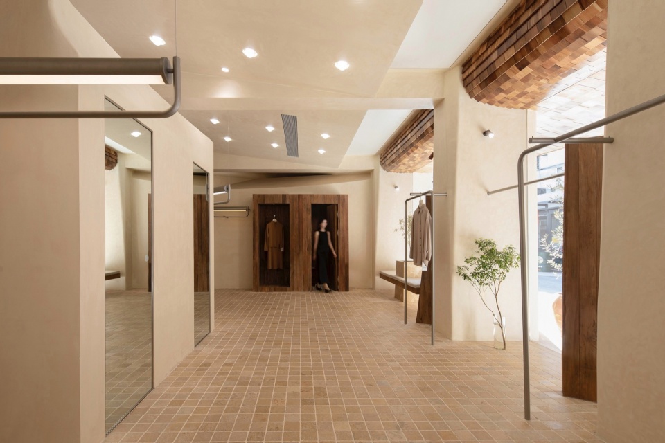 We tried to harmonize the objective factors and needs of the project, ensuring they found an appropriate way to coexist. The thickened corridor columns were a result of the difference in dimensions between the original structure’s inner and outer columns. The newly shaped, tapered columns, after being polished, have a warm, antique texture. The “wooden beams” suspended from the ceiling were designed to accommodate the installation of garment hangers. They interlock with modern concrete beams using traditional methods, thus recalling a fragment of the memory of past wooden beams. The sloped ceiling, close to the structural beams, was created to avoid the air conditioning pipes above, resulting in a continuous, unbroken gabled roof. Therefore, from a construction perspective, we did not physically build an entire house, but once a customer rests and looks around, following the contours of the space, perhaps in a fleeting moment, this “non-built” house echoes another house once visited—a place of shelter under a low, sloped roof, where we once paused and instinctively pulled down the collar of our clothes, reconnecting with familiar memories.