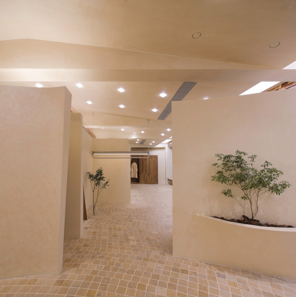 Around the “inner courtyard,” three distinct display areas are connected through a flowing circulation. Departing from the typical clustered fitting room layout, each area is given its own unique volume and form. Elongated tail ends, gathered upper openings, raised corner lines, walls stripped from columns, and recessed openings at the corners create an organic flow, transforming what was originally a rigid layout into a series of harmonious, soft “small houses” scattered along the space. In the corners, the shapes of the warehouse and restroom ceilings are intentionally lowered into sloped planes, enhancing the image of small houses.