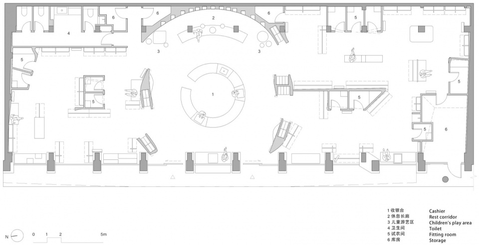 围绕着“内院”两侧的流线,彼此串联起三个陈列区域,摈弃了集合式的试衣区布置方式,而赋予其独自的体量形象,拖长的尾部、聚拢的顶口、上扬的角线、从立柱上剥离出的墙面、在转角处凹陷下去的开口,使原本规矩的轮廓,呈现为互相呼应的柔和“小屋”,有机地错落在空间流线上。而在角落,仓库、卫生间顶面外形也故意放低作斜坡状,让它们看起来更有小屋的形象。