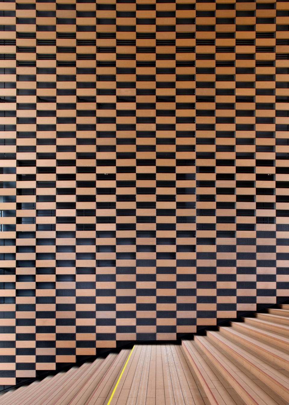 面向河流的外立面采用了由回收木材制成的犬牙交错的木质格栅,这一设计不仅能够柔化建筑的刚硬感,还兼具环保功能。格栅上的回收木材既能引入清风,又可有效遮挡太阳辐射,同时,这种木材的使用有助于减少空气中的二氧化碳含量。这一设计不仅连接了河流与建筑,还在城市环境中创造出舒适的空间体验。日本传统的木格栅是这一设计的灵感来源,而回收木材作为一种兼具历史感与现代性的可持续材料,也展现了对地球友好的理念。