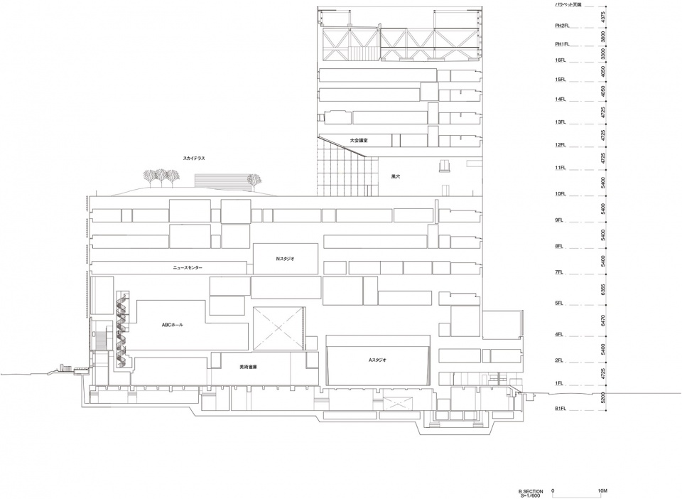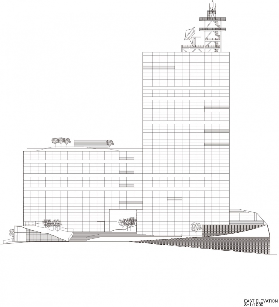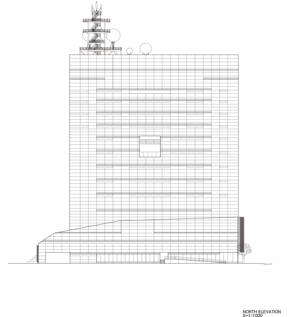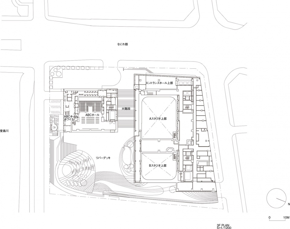 朝日放送新总部大楼坐落于大阪市中心的堂岛川畔。设计在确保广播电台安全性的同时,尝试打造一个对城市与河流开放的公共广场。这座大楼旨在将人与自然、建筑融为一体。建筑内设有两个大型“花园”——一个位于沿河的“河畔露台(River Deck)”,另一个则是屋顶上的“天空露台(Sky Terrace)”,为人们提供了最大程度亲近河流自然的空间。