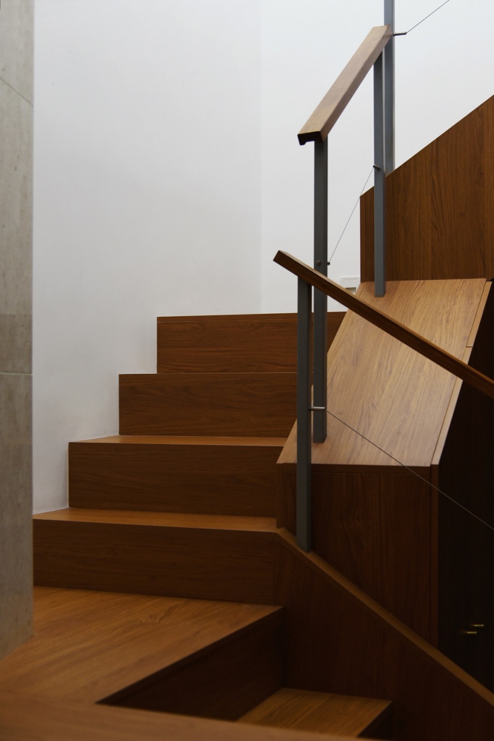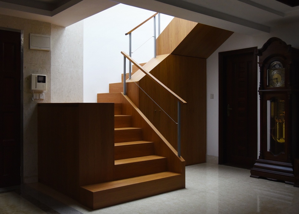 Due to the low headroom under the beams and uneven treads, the original curved staircase connecting the upper and lower floors is not convenient. There was also a lack of storage space, and clutter was often piled up underneath the stairs, affecting the look and feel of the living room. So we wanted the new staircase to become a piece of furniture – a combination of stairs, storage cabinets, and shoe cabinets placed in the original corner. This composite piece of furniture became efficient and approachable.