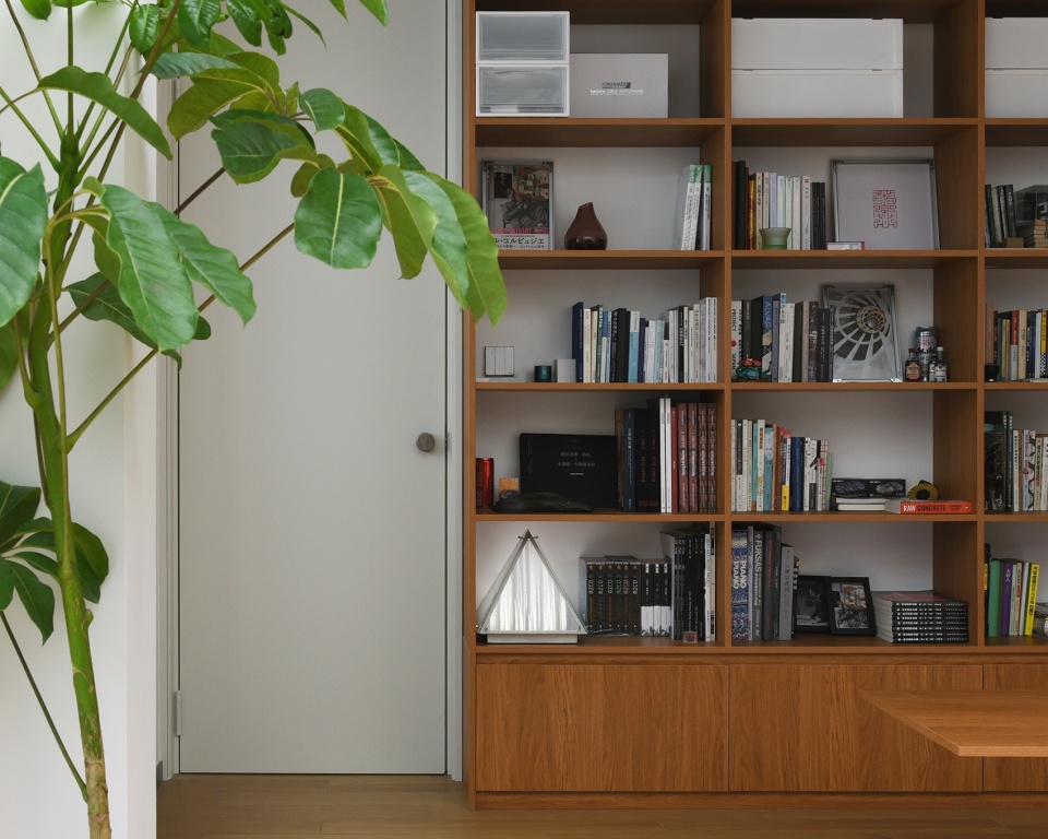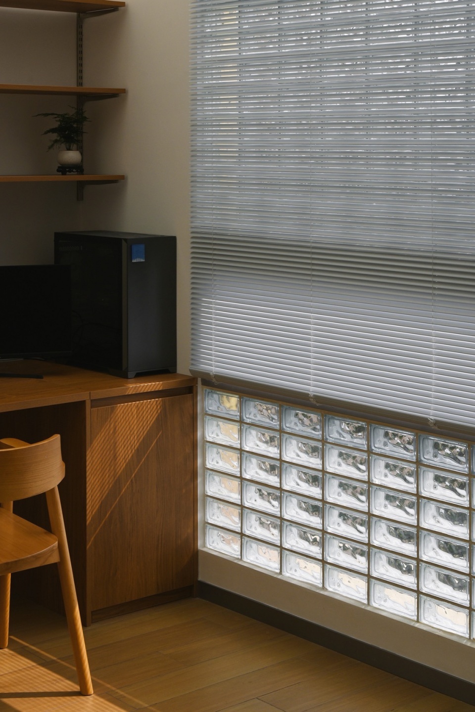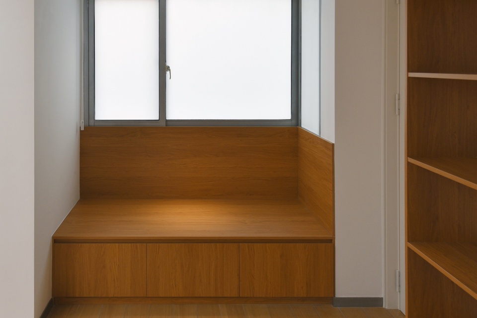 As a designer who often needs to work from home, a comfortable workspace is a top priority for the residence. The workspace was transformed from a vacant sunroom. The original sunroom was leaking partially due to the aging glass roof, so we decided to repair and renovate it in a low-cost way – without replacing the whole glass roof, we repaired the leakage points and added a translucent roof on top of it. The new double-layered roof optimizes rainwater drainage and insulation. The new roof and the glass block wall bring soft daylight in home, creating a natural sense of relaxation. The “half” daylight blurs boundaries between interior and exterior, bringing new space and activity.