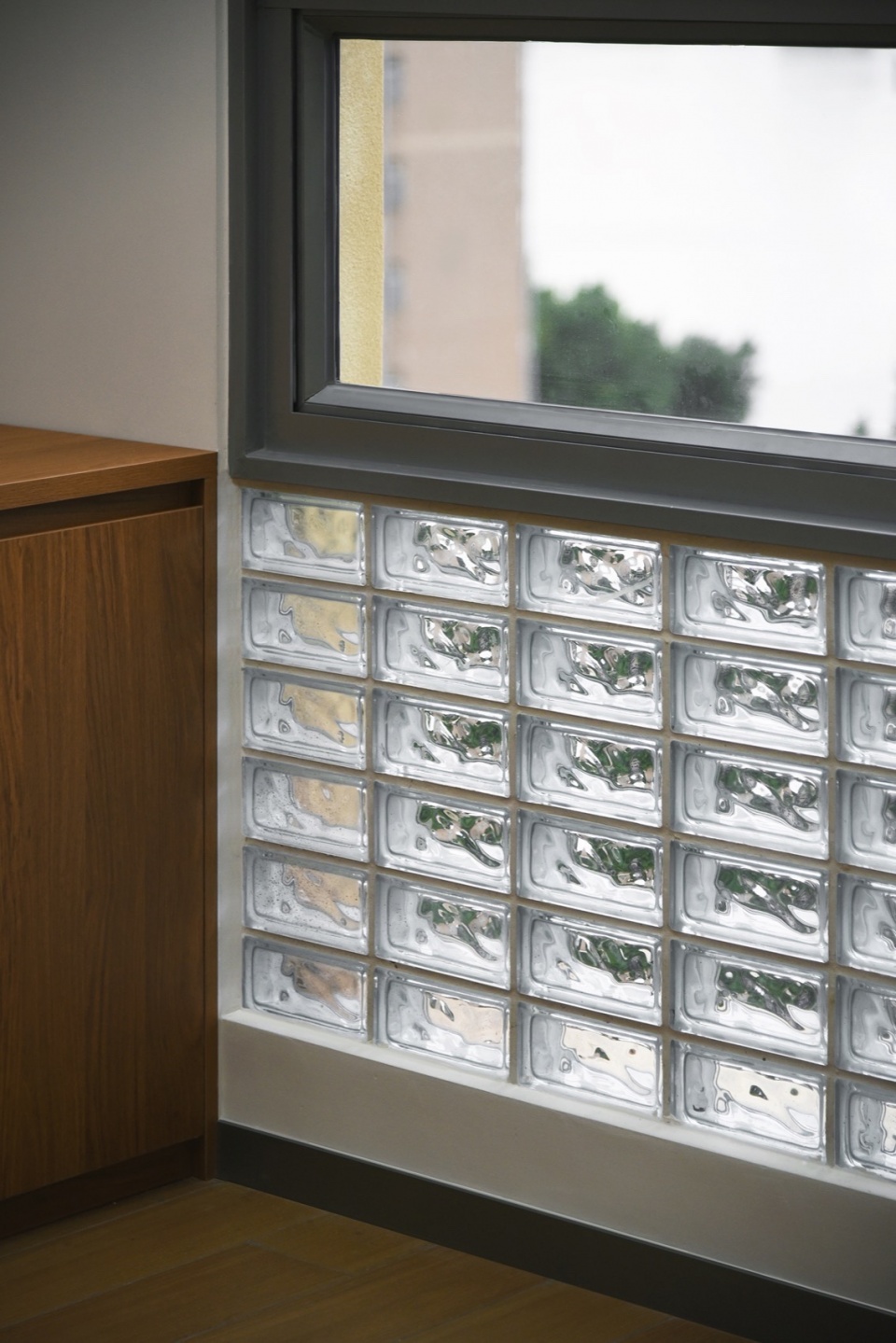 The balcony is the bedroom’s barrier to the outside. The glass block wall filters the direct sunshine and the neighbors’ glances, bringing gentle light and restrained views inside.