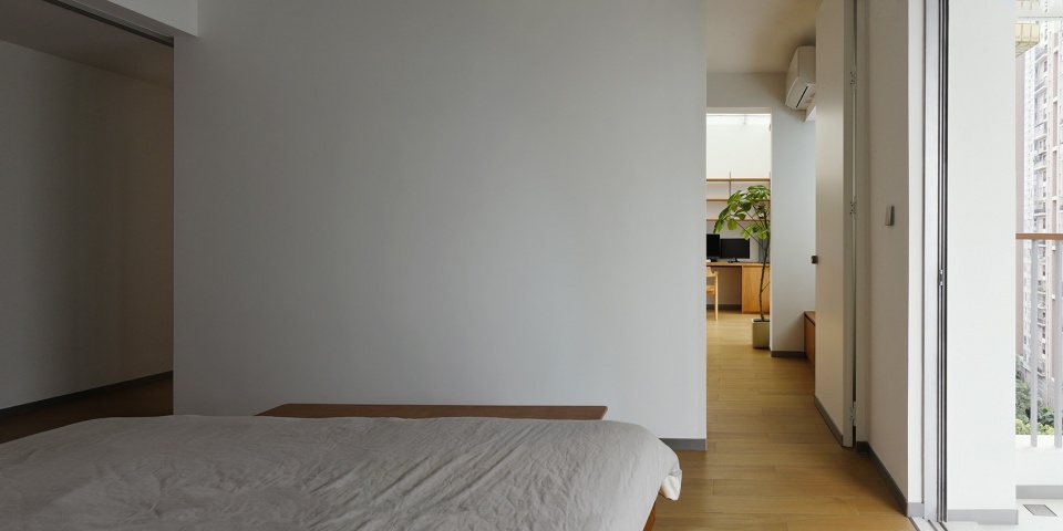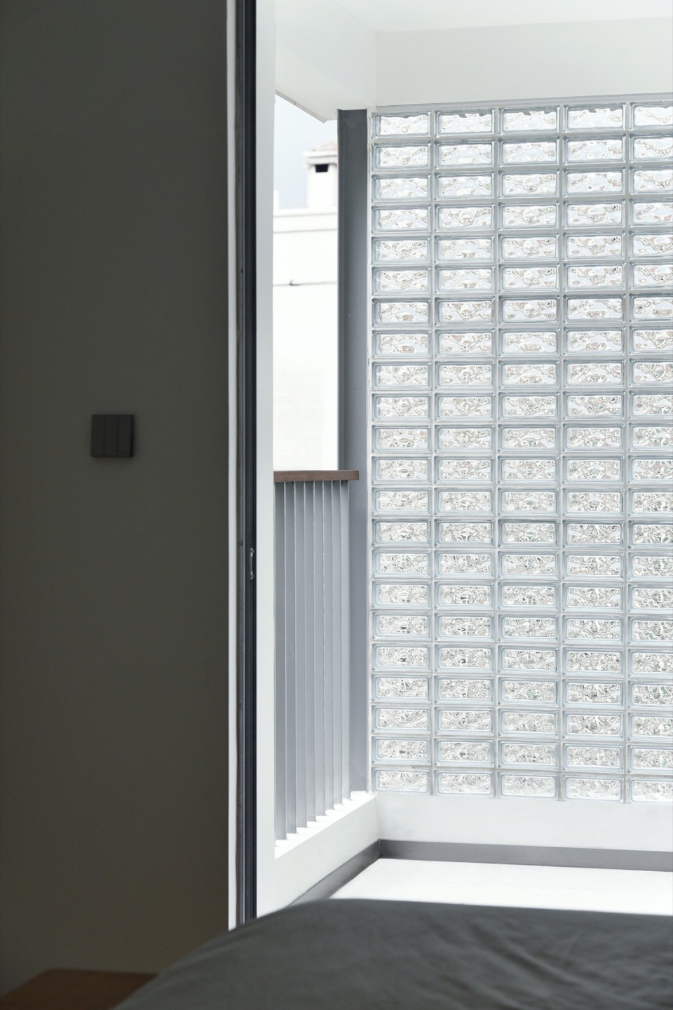 阳台是卧室与外界的屏障,玻璃砖墙过滤了太阳的直晒和邻居的对视,把温柔的光和克制的景带到室内。