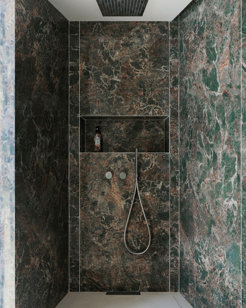 When naked, the body’s perception of space is amplified. Therefore, in the design of the bathroom, we try to eliminate the height difference and separation as much as possible, and use materials with a huge scale, vibrant colors, and rigorous and delicate butt joints to create a space that makes people feel relaxed both physically and mentally.