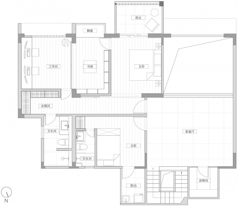 整个改造围绕“置入”的主题。原本住宅空间充足却缺少功能,新的设计打破原有空间秩序,置入新的空间与物件——包括家具化楼梯、日光工作间、通透洄游的卧室、重组的阳台与卫生间,并让新的空间与人发生互动,产生场景,重构新的生活方式。
