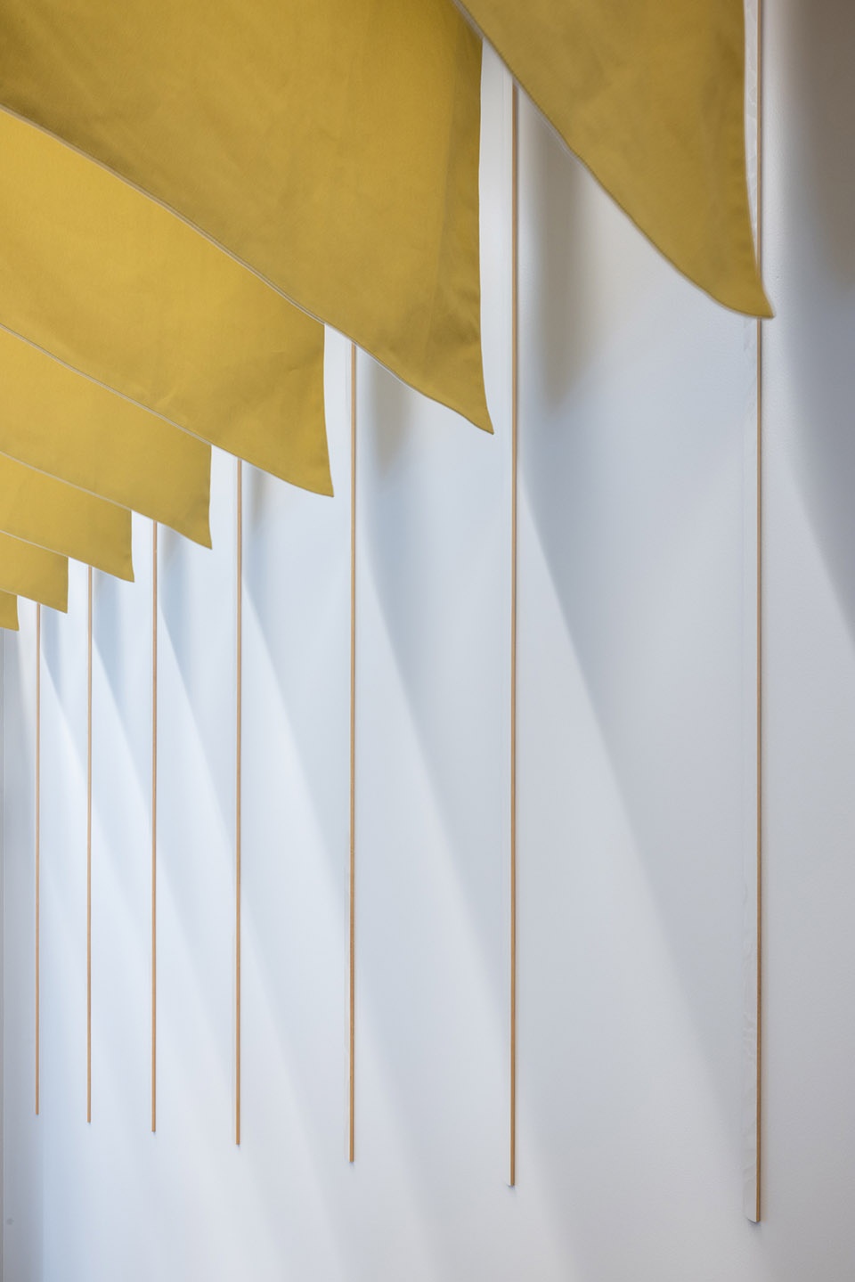 餐厅的座席区悬挂着十片大型暖簾,层层相叠,营造丰富的空间感。通常,暖簾采用11号帆布制成,而此次设计选用了更厚的8号帆布,并以袋状缝制,使其更加厚重。单片暖簾尺寸达6米宽,柔软且富有重量感,轻触时会随之摇曳,形成独特的动感体验。此外,暖簾的正反两面采用不同颜色的帆布,并且随着位置向后延展,每片的长度逐渐增加。这种设计使得从街道进入餐厅、在店内用餐,乃至用餐结束离开时,都会对空间产生不同的视觉感受。