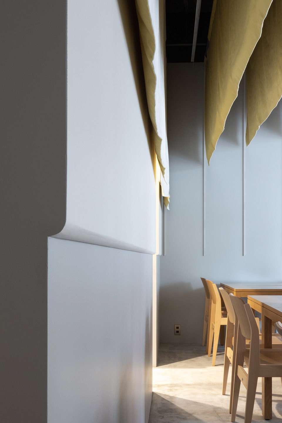 The intention was to create a sense of space in the dining area, which tends to be a fixed background for dining. Unlike the hard, immobile wall surface, the noren, which sways slowly when people actually move, is used to create a more relaxed atmosphere.