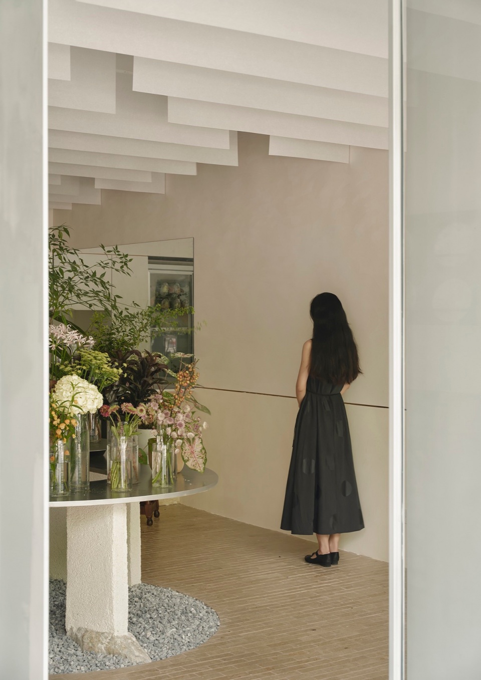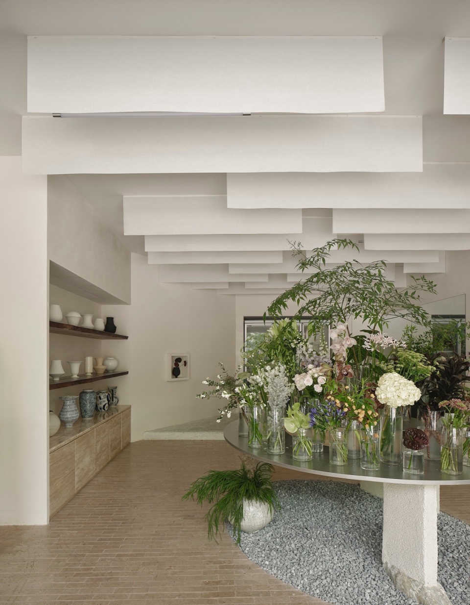 In terms of functional layout, we designed two counters. The inner counter is primarily for the florist’s daily work, with a stainless steel surface that combines aesthetics and convenience. The front of the counter features travertine elements, with natural textures and a sense of returning to nature. The oval island in the center of the space is the visual focal point of the flower shop. The island is supported by several stones and bricks, with the display surface set at two different levels to better showcase a variety of floral arrangements and meet retail needs. The base of the display is treated with gravel, as if a corner of an outdoor garden has been brought indoors, allowing customers to feel the essence of nature while selecting flowers.