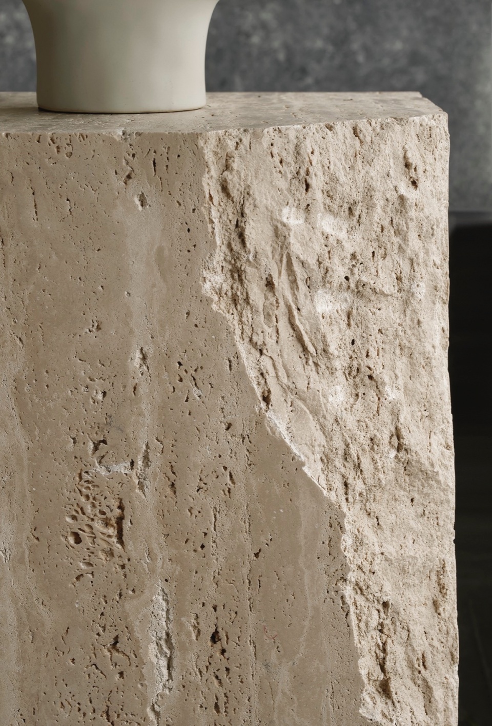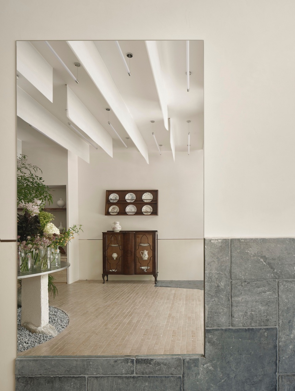 在两侧区域设置了镜子。镜子的存在增加空间的视觉延伸感,与此同时,镜面提供了不同的展示花艺作品的视角。左侧的柜体收纳区域采用老木头作为层板,底部的柜门延续了洞石材料,与地面相互呼应,使整个空间在视觉上更加和谐。