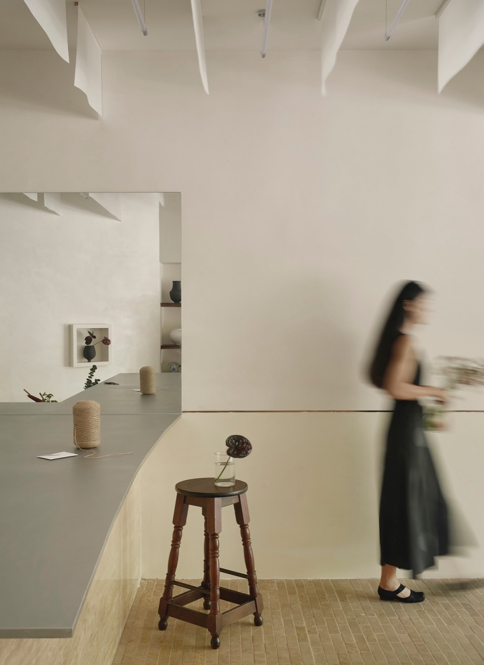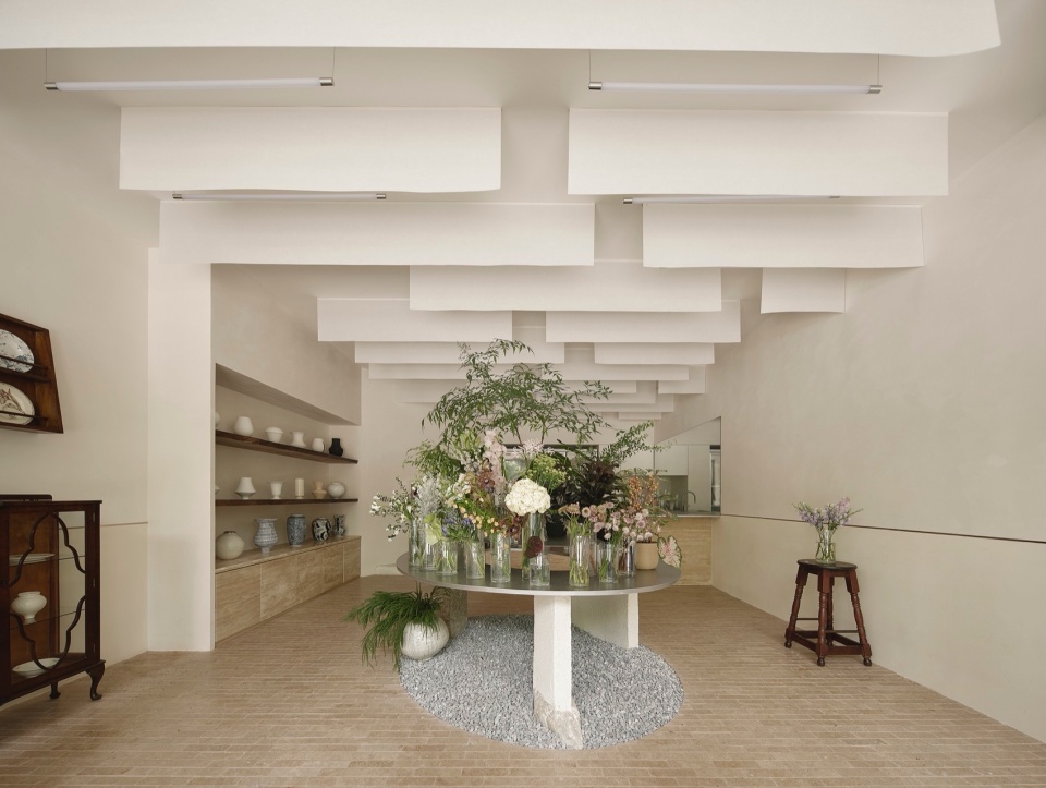 For the interior of the flower shop, we chose a large number of natural and handcrafted materials to create a tranquil and warm atmosphere. To continue the theme of morning light, we installed layers of translucent washi paper in the ceiling space, following the depth of the room. The washi paper acts like a soft mist, filtering the light into dappled shadows, making visitors feel as if they are in a morning forest, surrounded by delicate, grainy light, and fully immersed in this poetic space.