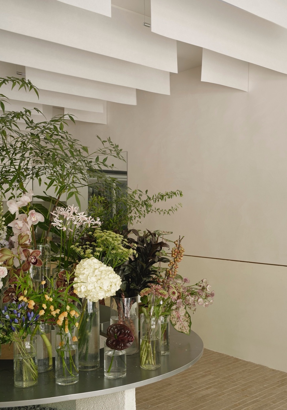 Near the entrance to the counter, a protruding niche is set up as a weekly display area for the florist’s featured products, like a small surprise box that offers new discoveries to customers each time.